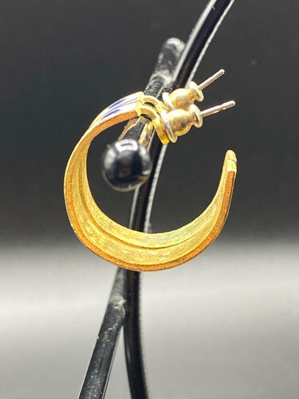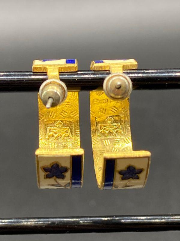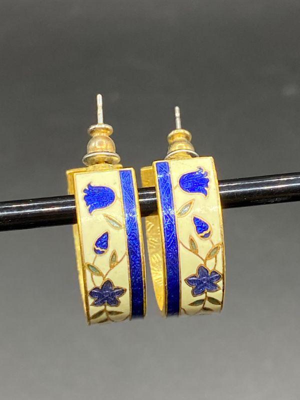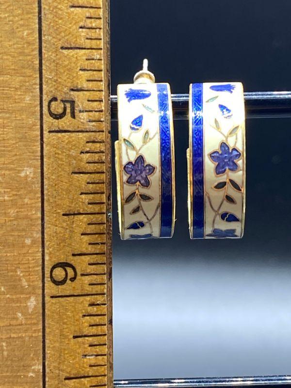 Beautiful blue floral cloisonne hoop earrings. Gold tone setting. For pierced ears. About 1" size.