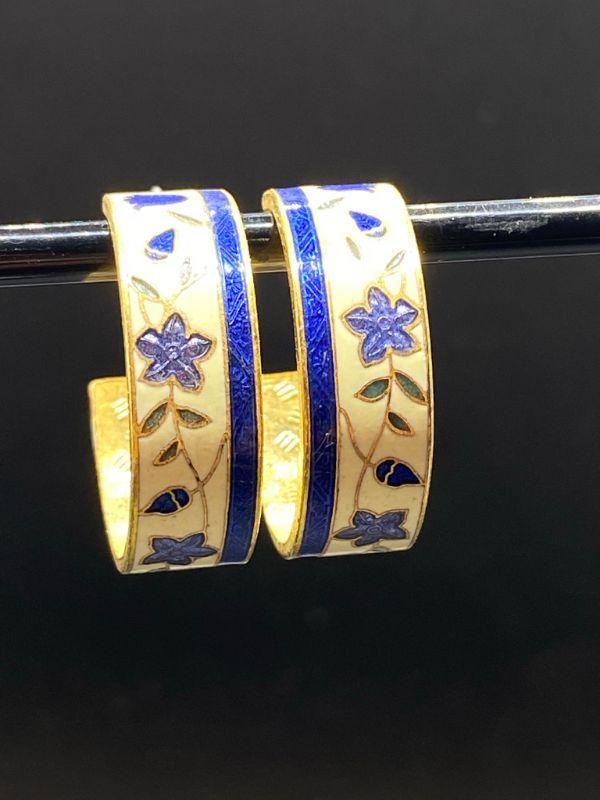 Gold Tone Blue Floral Cloisonne Hoop Earrings