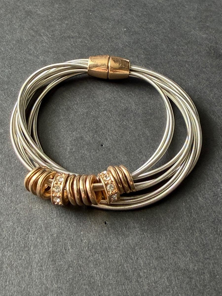 Gold tone bracelet features shiny gold discs and white rhinestone encrusted rings on spring-like silver bands for an edgy look.