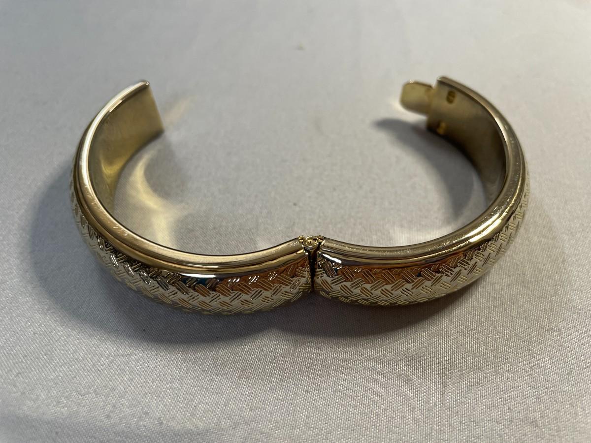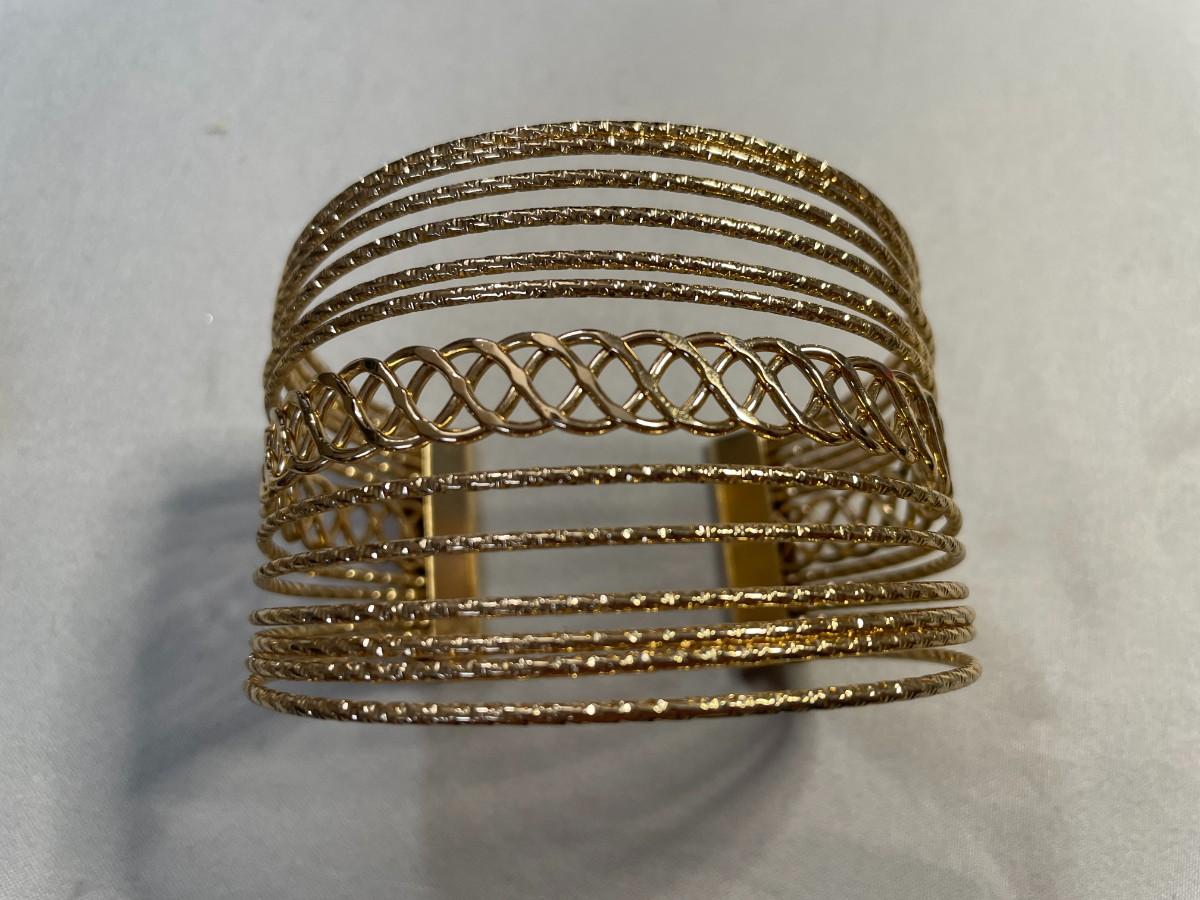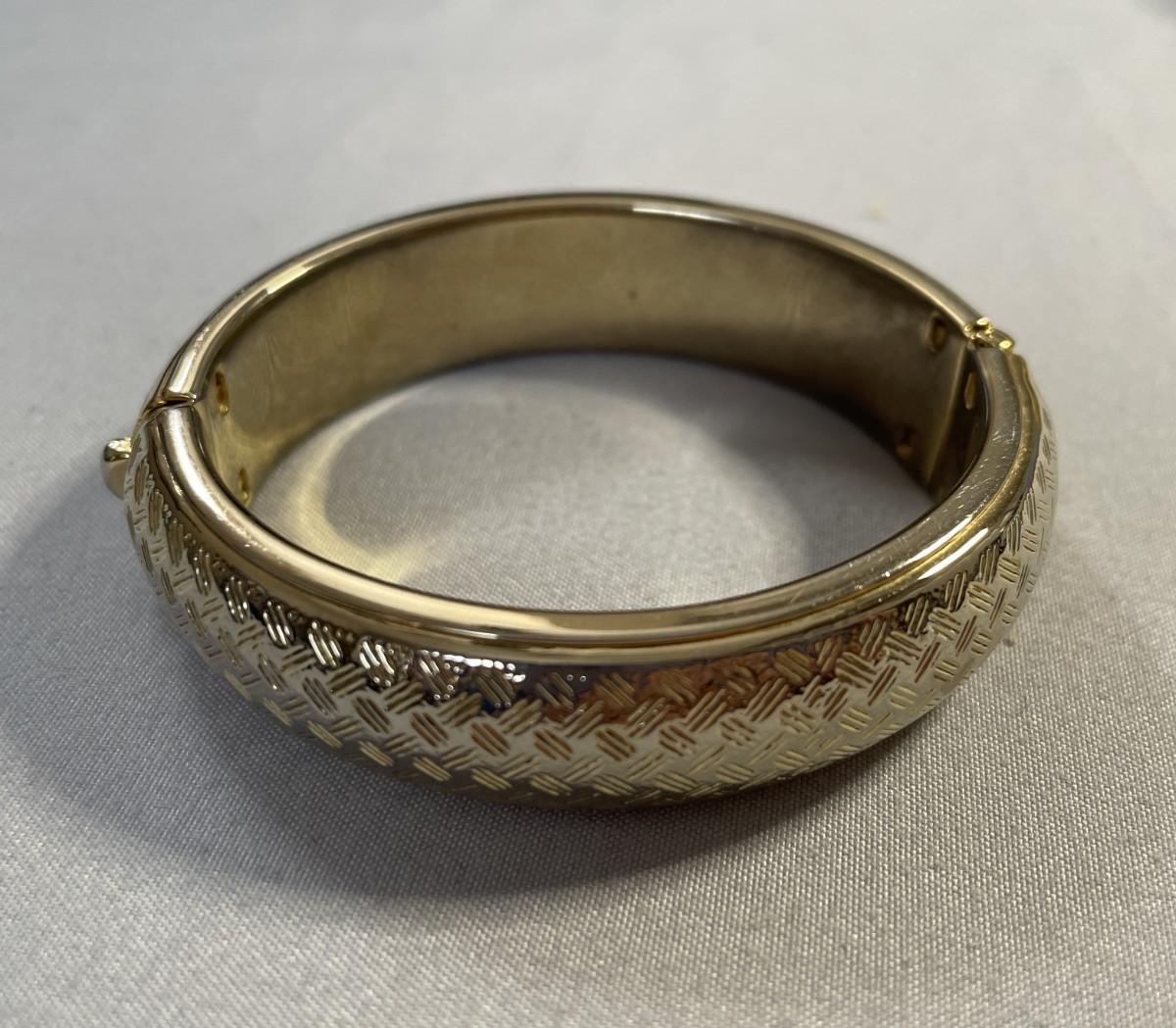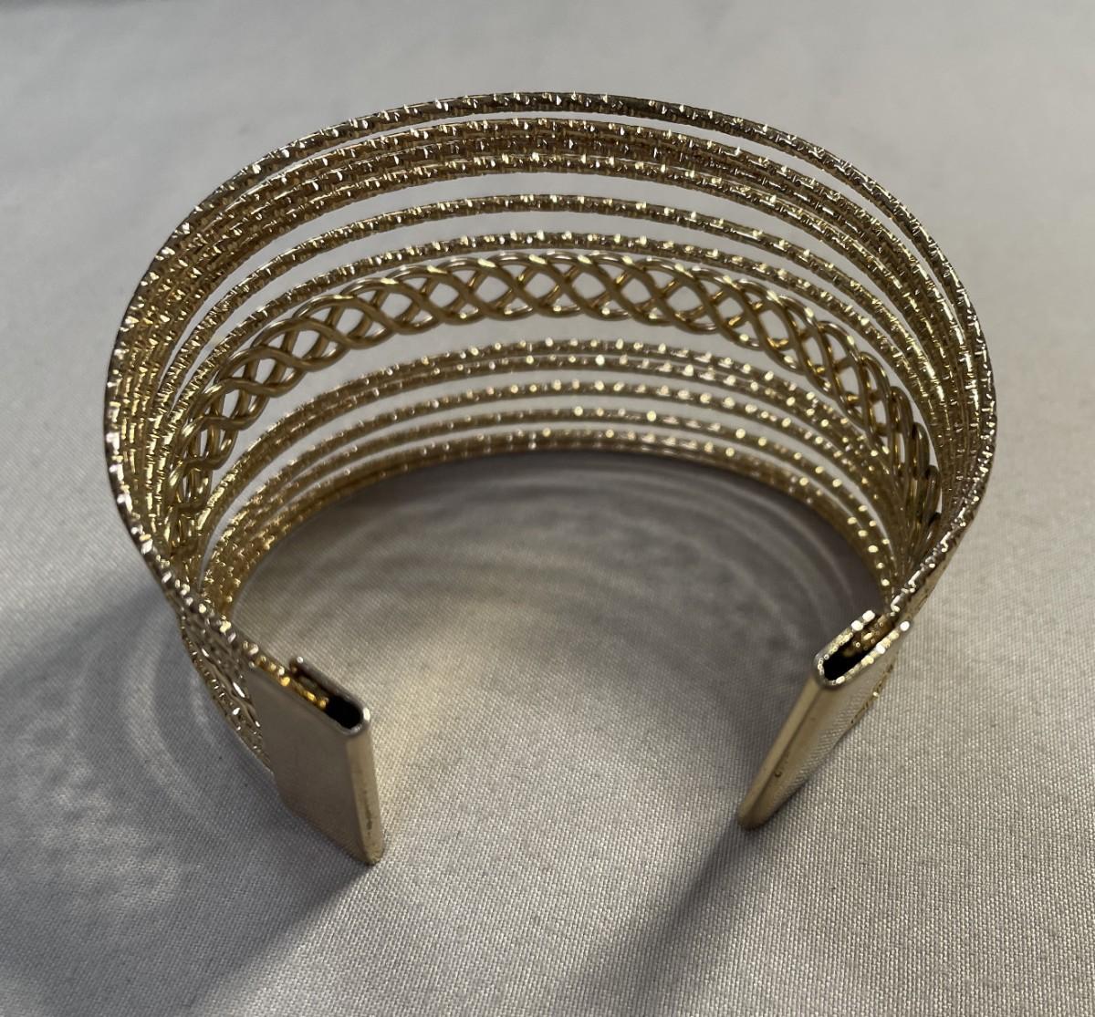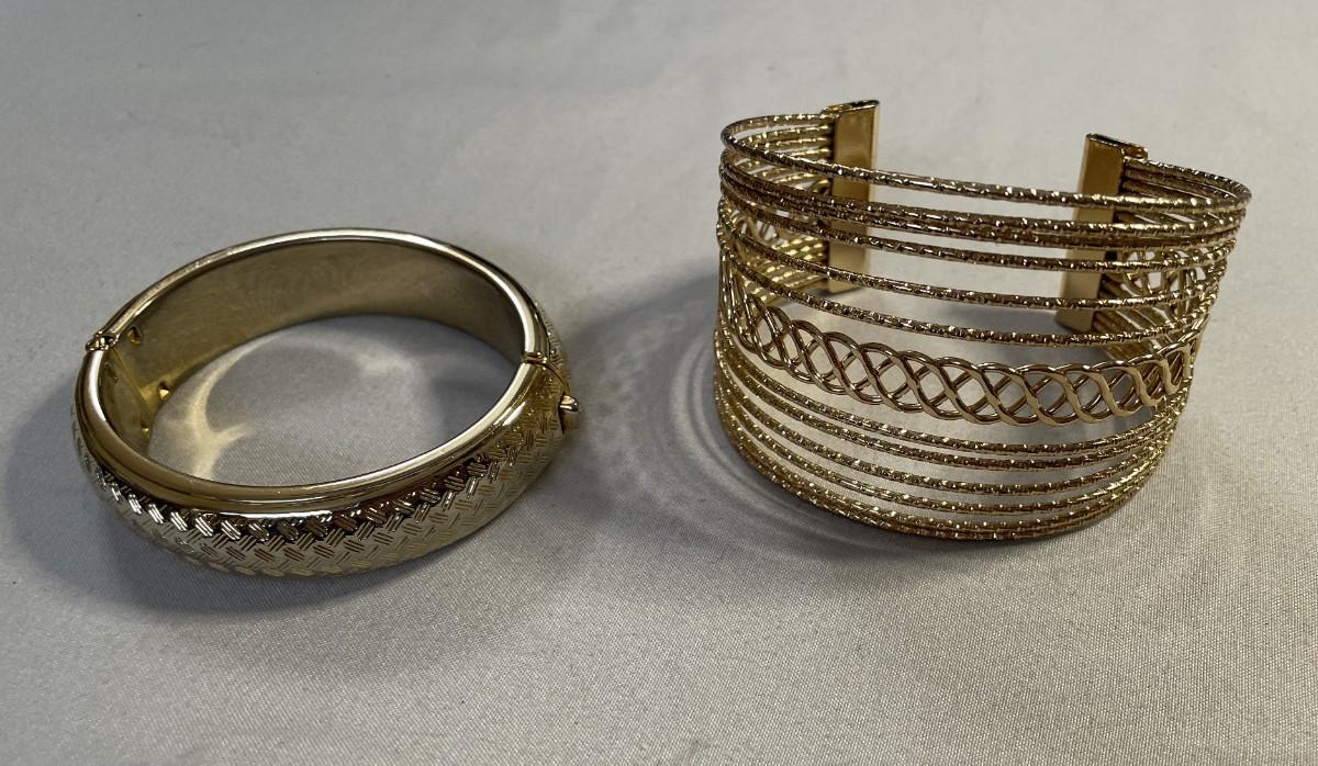 One is a multi-wire cuff bracelet and the other is a basket weave pattern, hollow bangle. Both are in excellent condition and neither is marked. The cuff bracelet will fit a large wrist and the bangle bracelet is about 2.25 inches inside diameter.