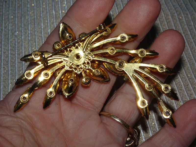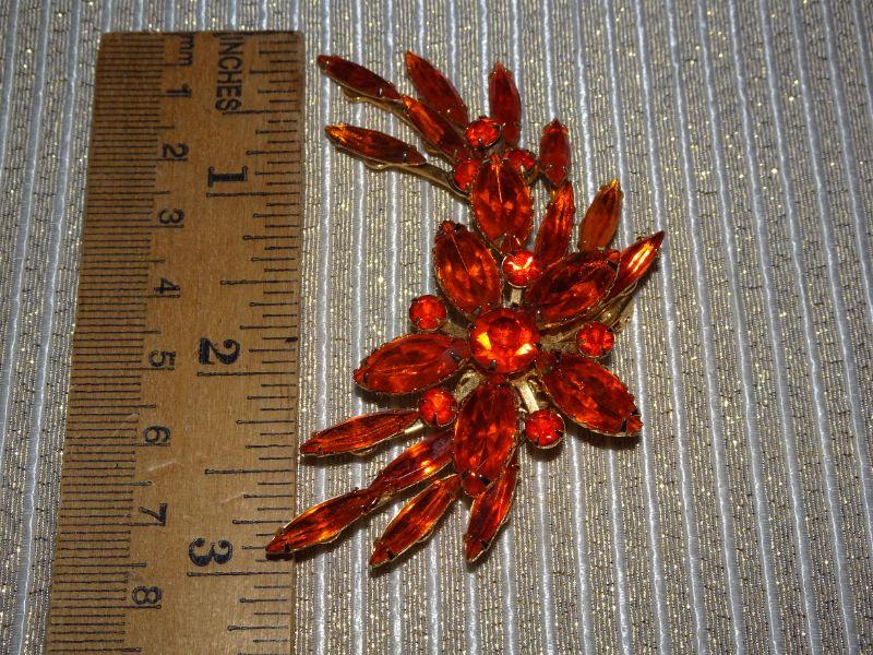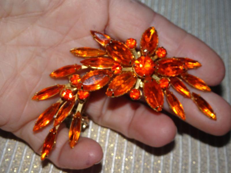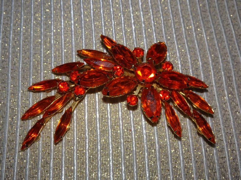 Gold Tone Brilliant Orange Mid Century Rhinestone Brooch AMAZING!