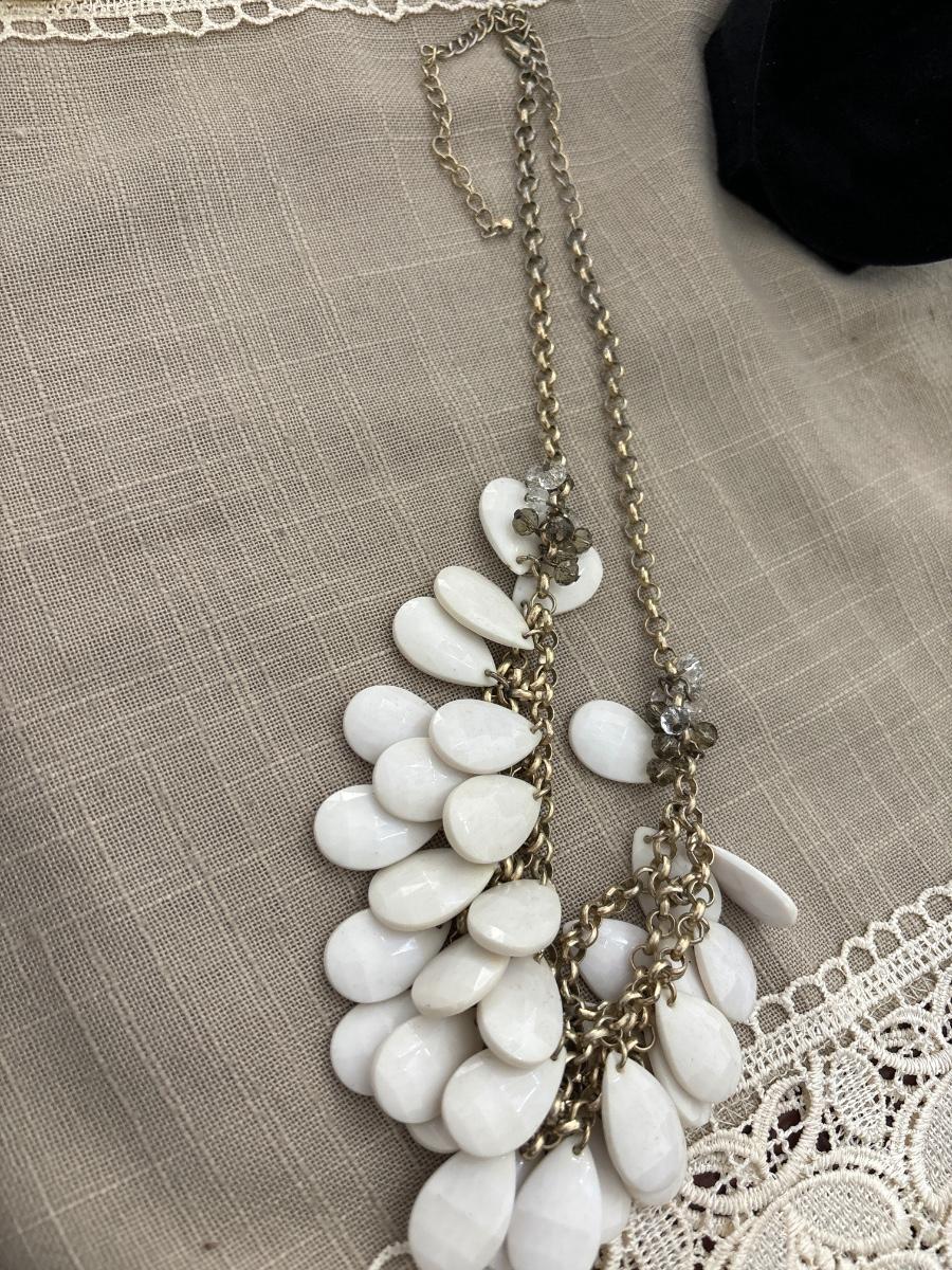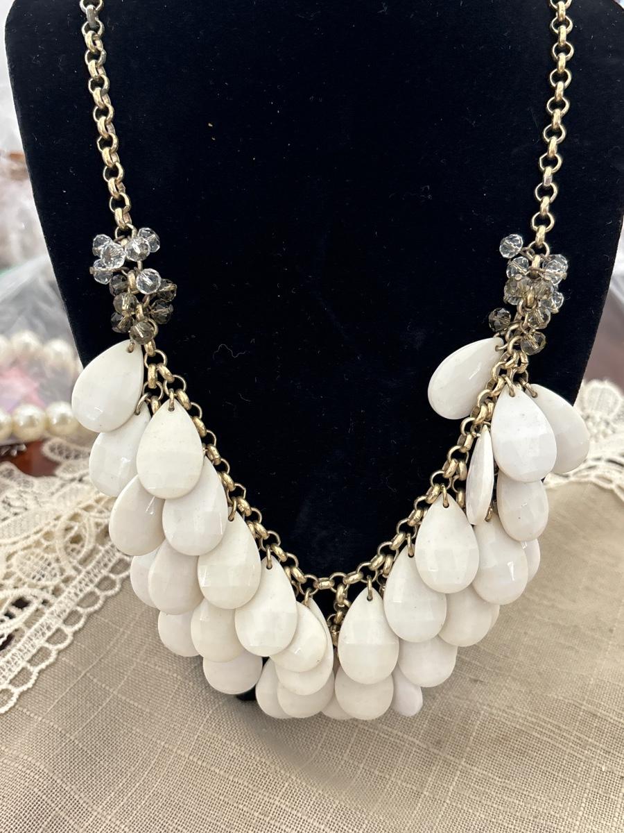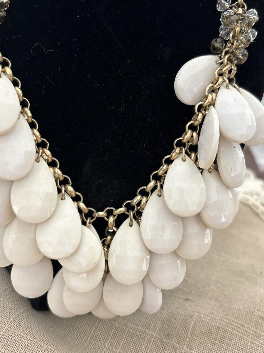 Gold Tone Chain Link 26 Inch Off White Teardrop Statement Bib Necklace
