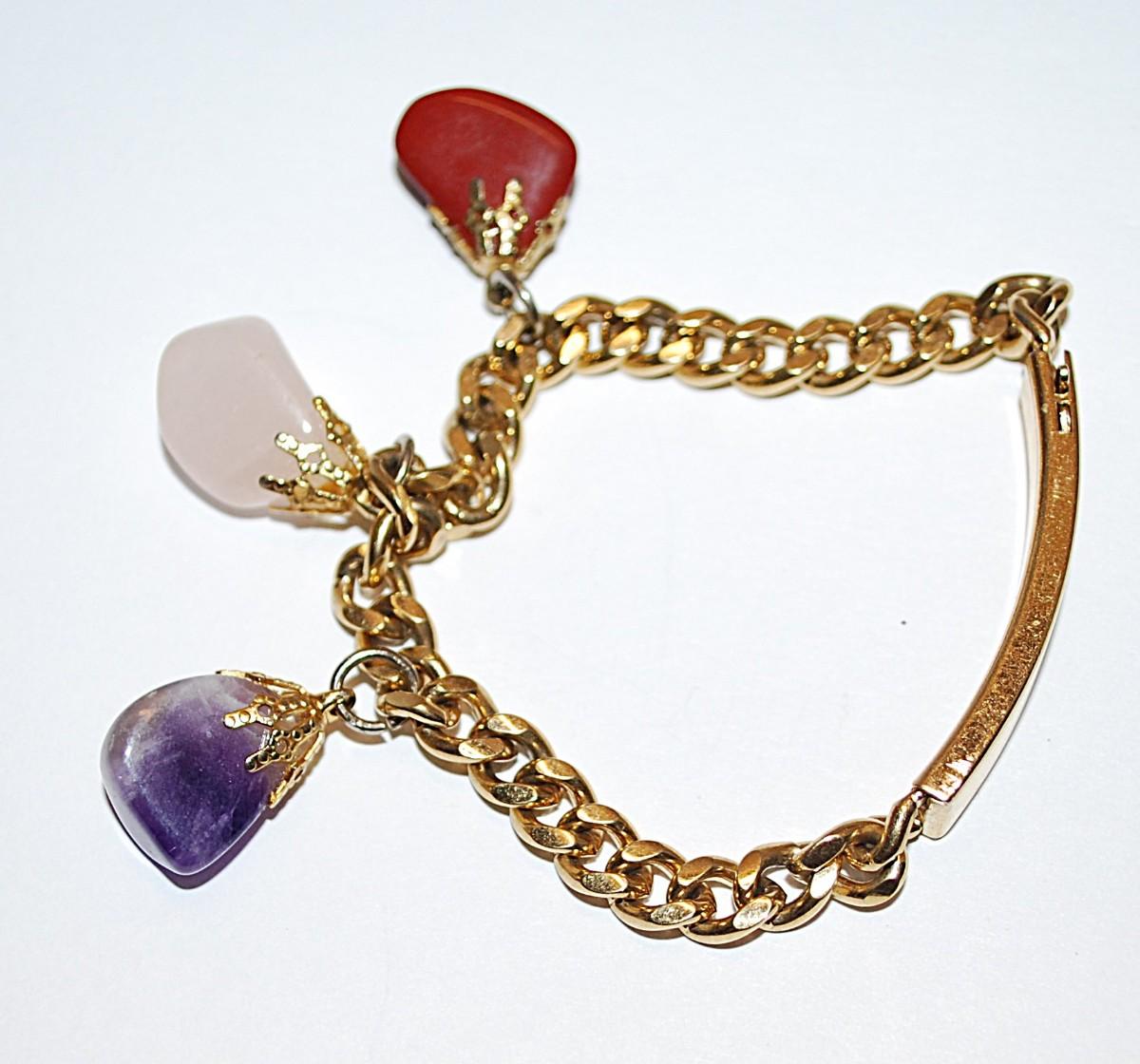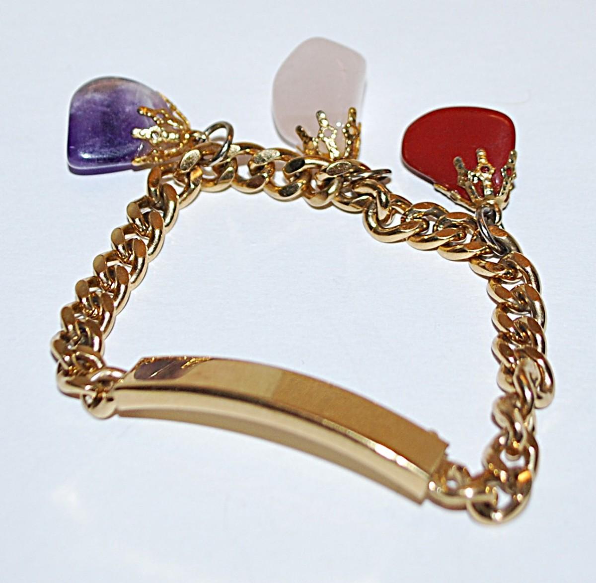 Gold Tone Chain Link ENGRAVING BAR BRACELET (2" Opening) with Red, White & Purple Dangle Stones