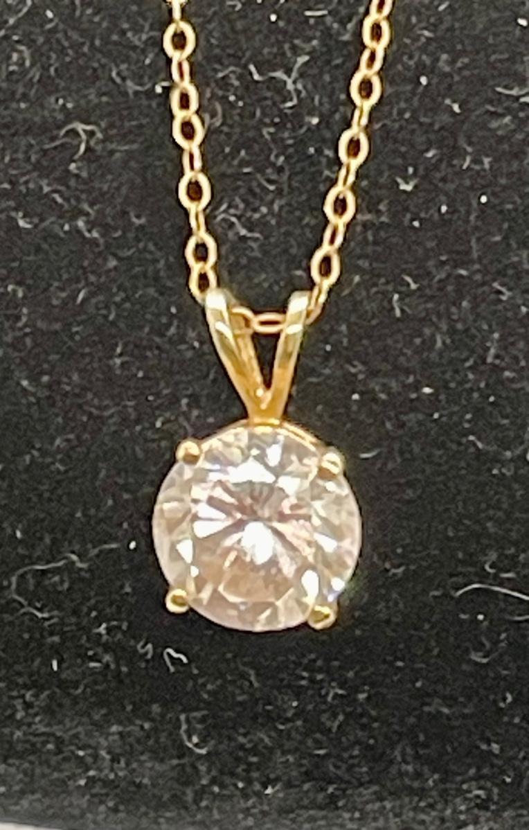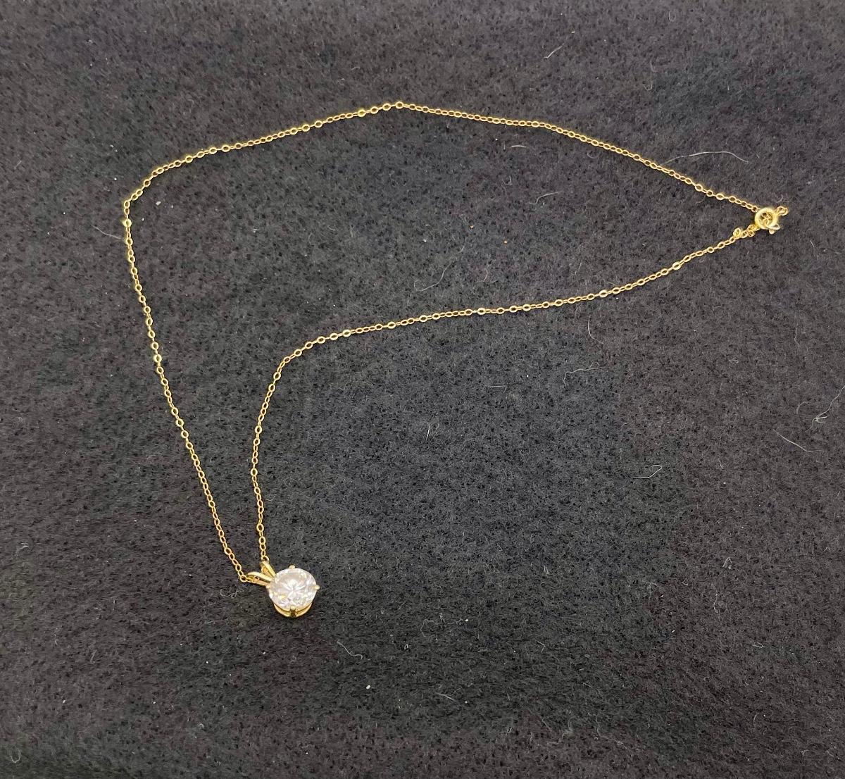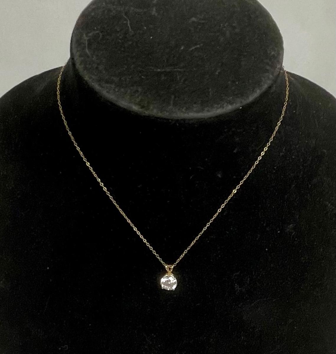 Gold tone fine link chain with large round CZ is a gold-tone setting.