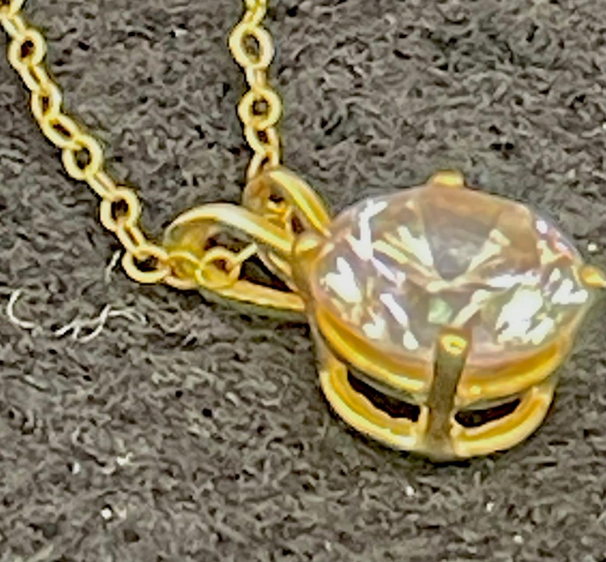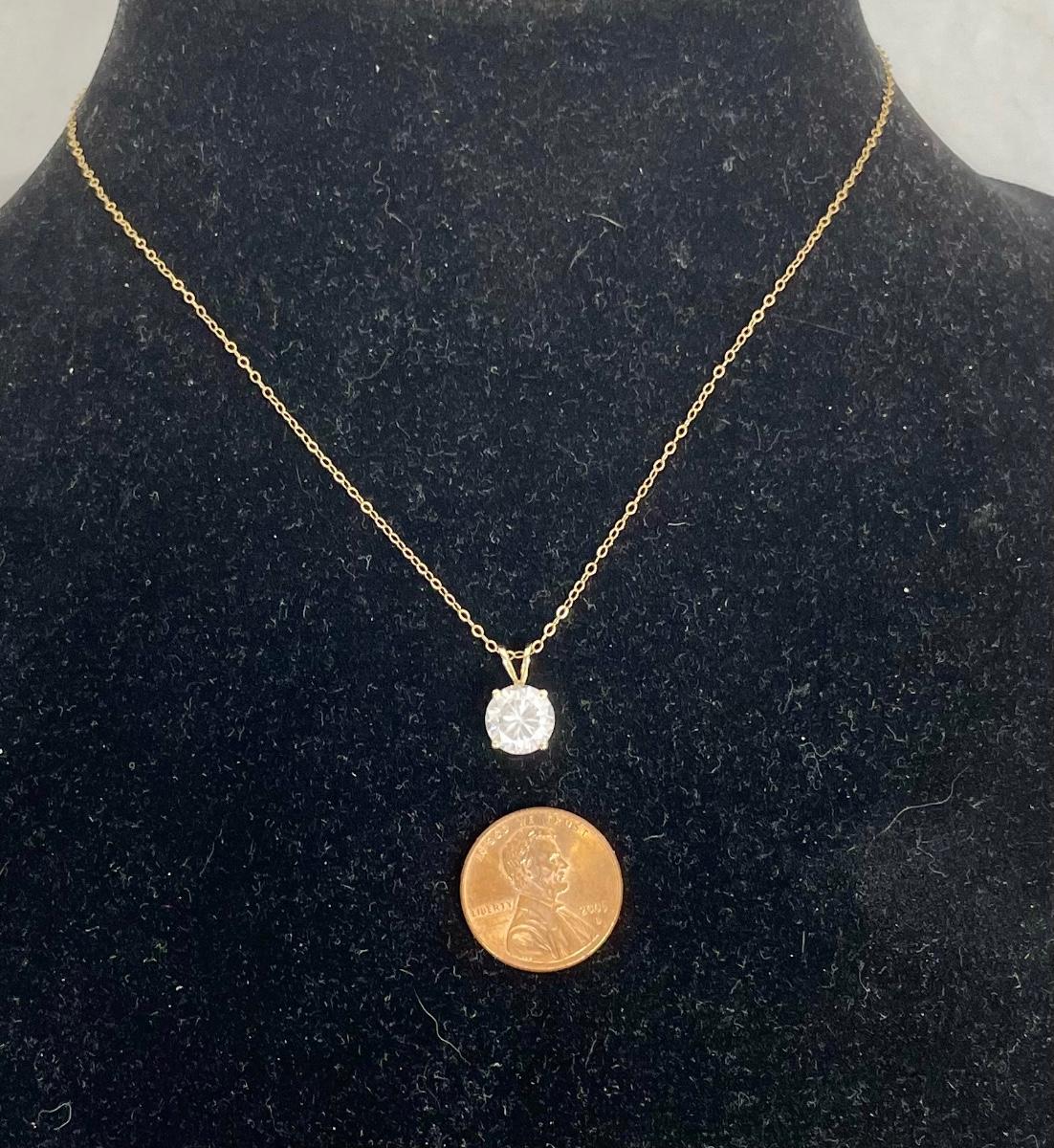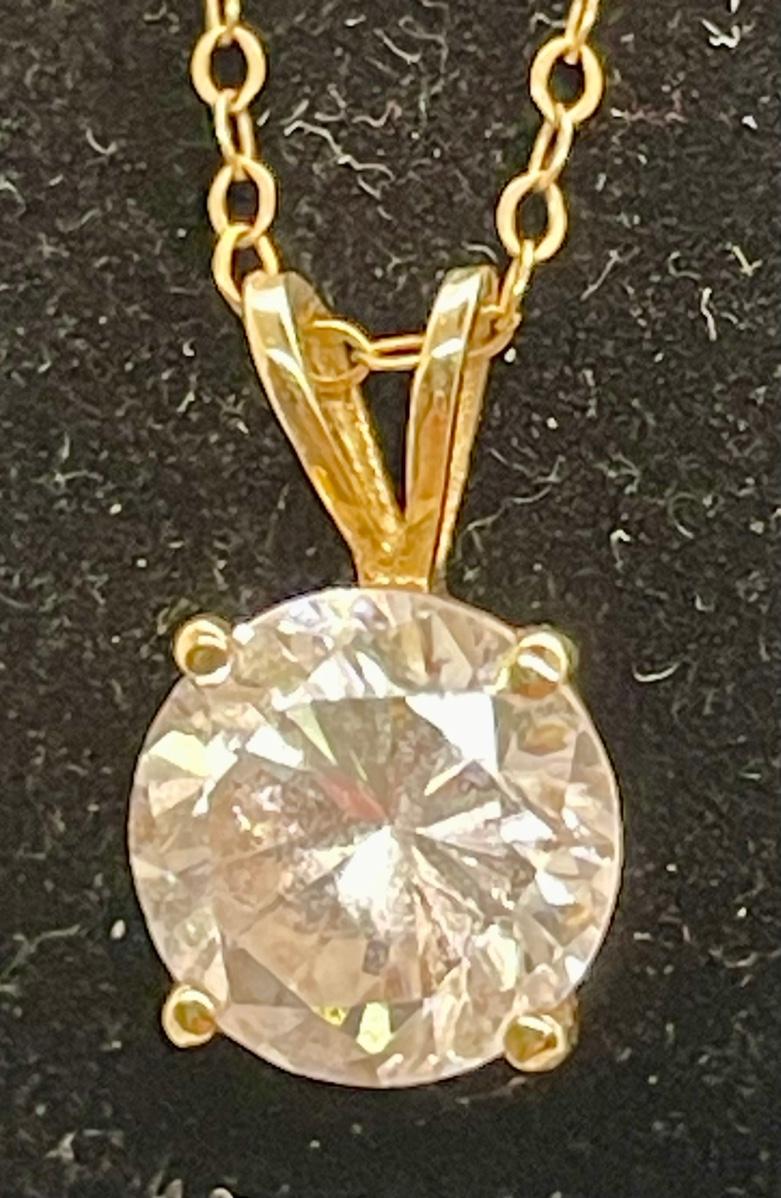 Gold tone fine link chain with large round CZ is a gold-tone setting.