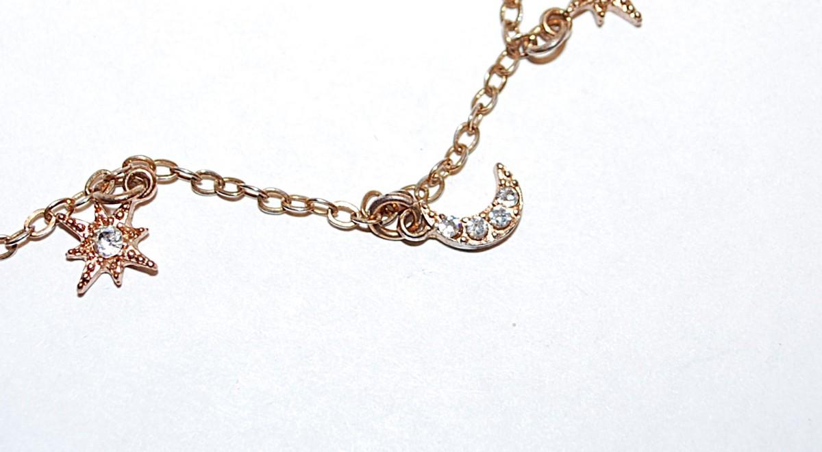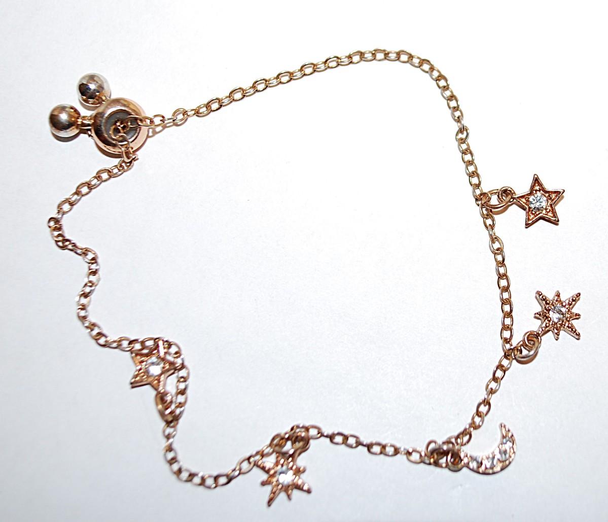 Gold Tone Chain "STARS & MOON" BRACELET (3" Opening) with Bejeweled Stars and Moon and RING and Globes Clasp