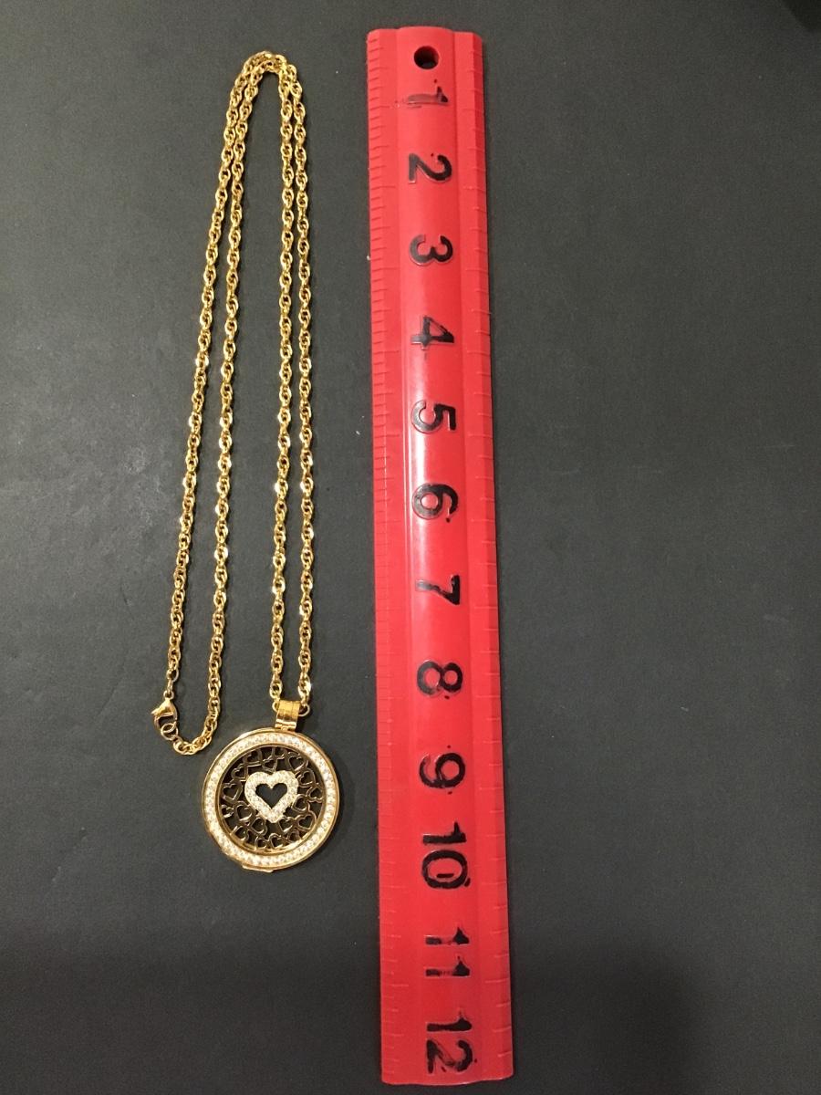Gold tone chain with gold tone, Carlo Biagi, coin pendant with rhinestones. Please see attached photos.