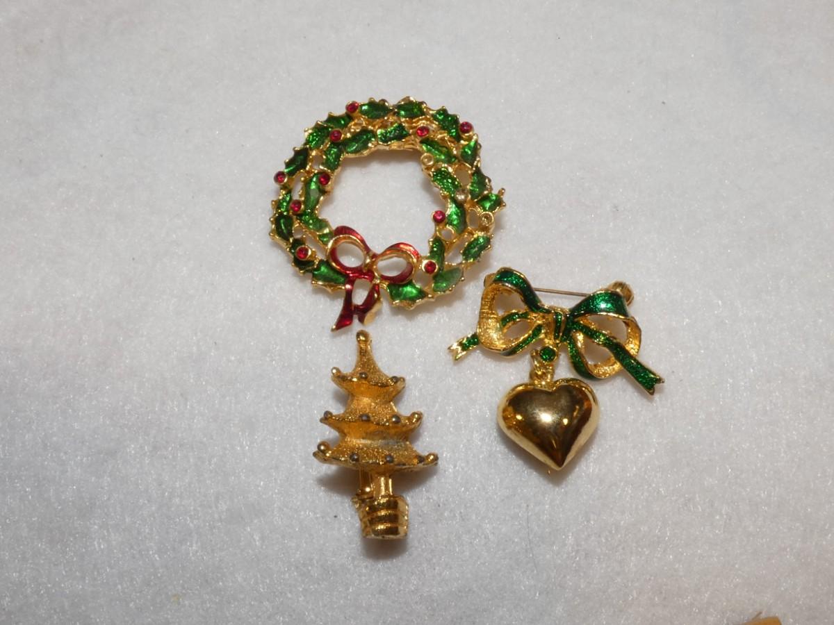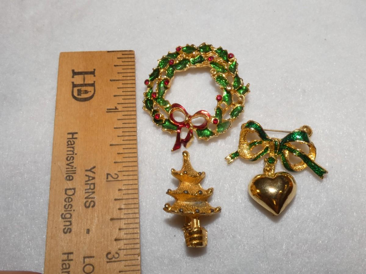 Gold Tone Christmas Pins, (3) Wreath, Tree, Ribbon w/heart