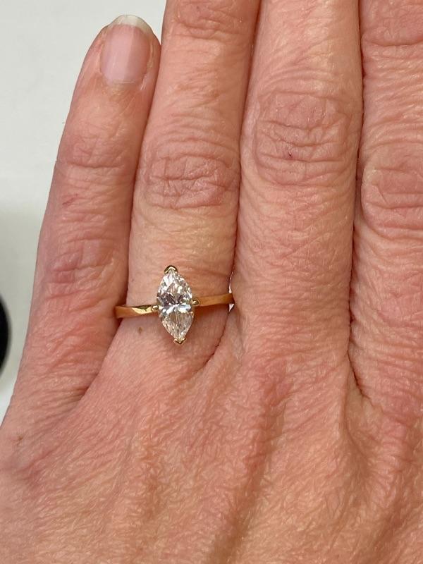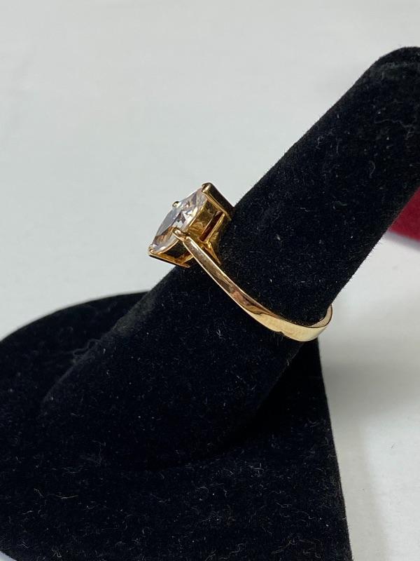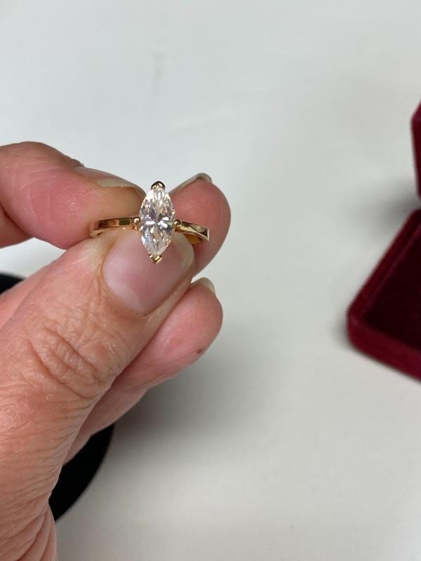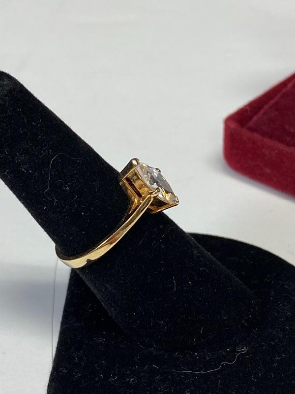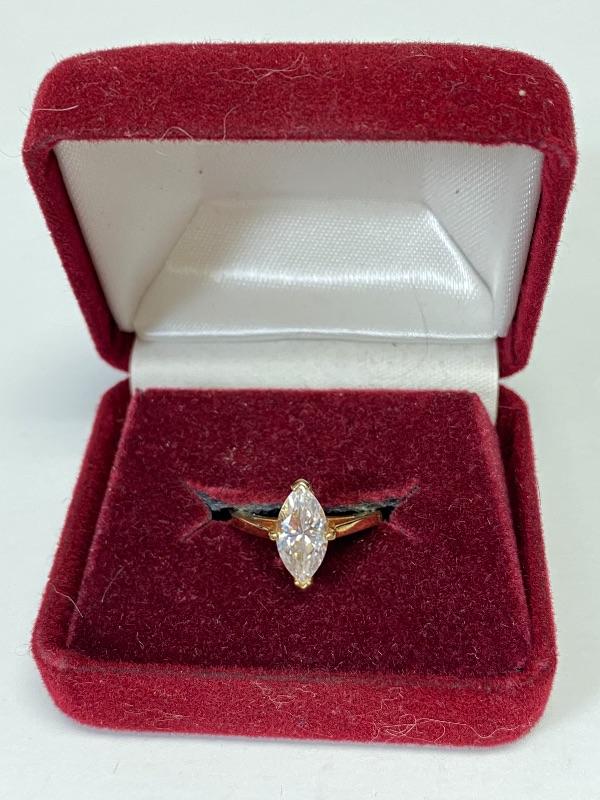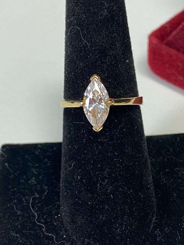Sparkling marquise cut CZ solitaire ring. Gold tone setting. Size 7, stamped inside. Stone is almost 1/2" in length. Comes in ring box.