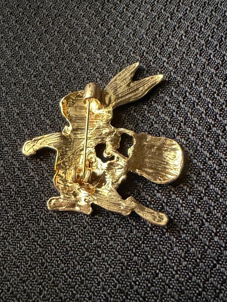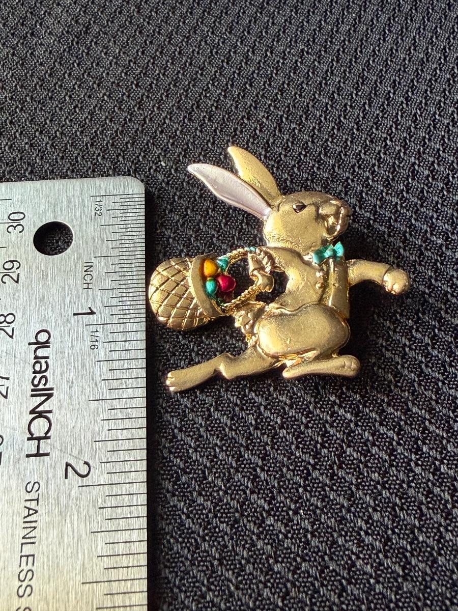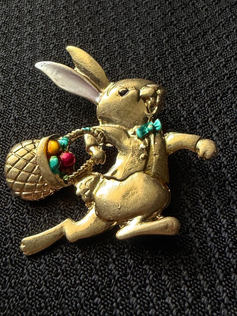 Gold tone Easter bunny with colorful eggs in basket fashion pin