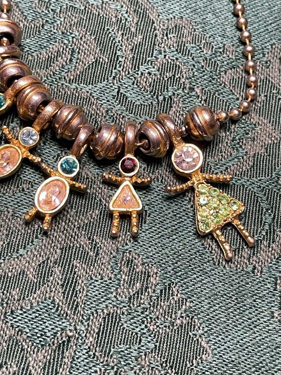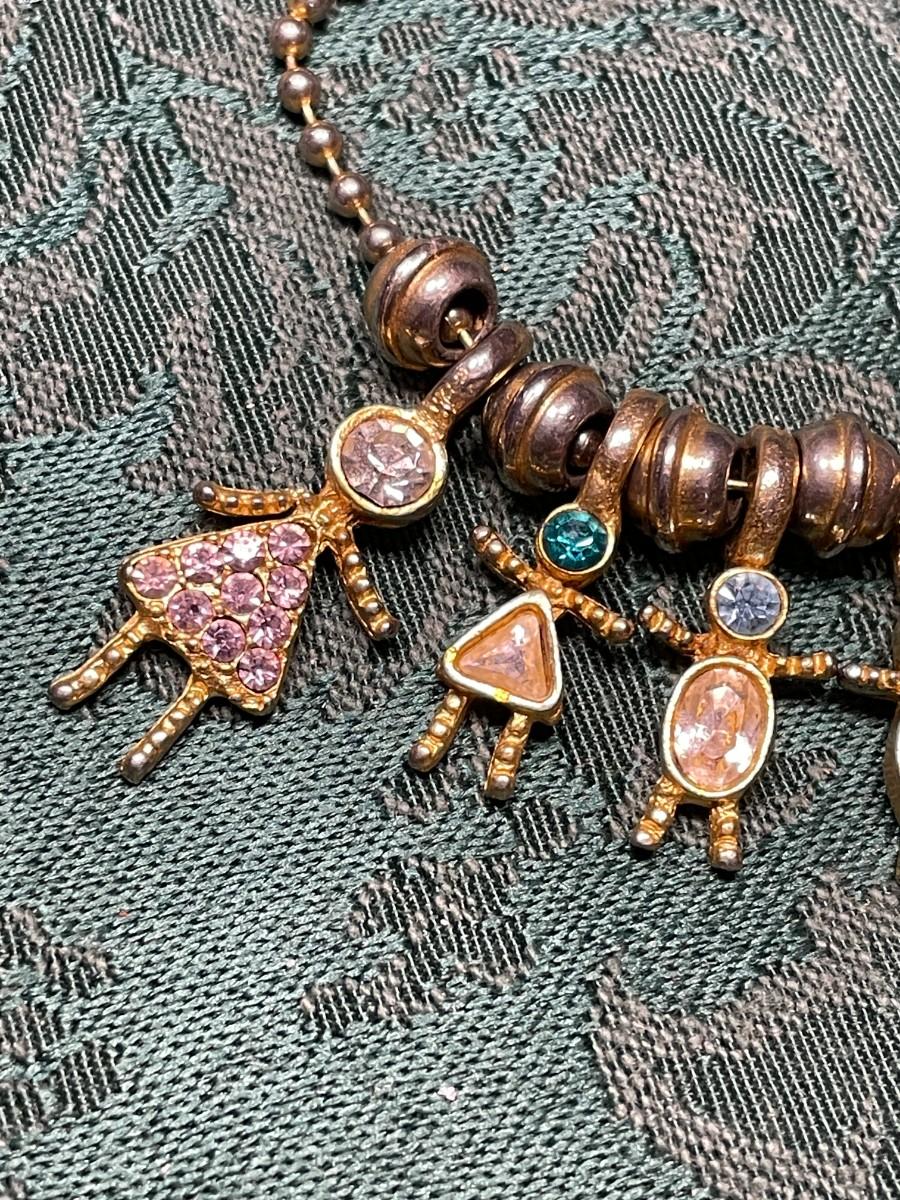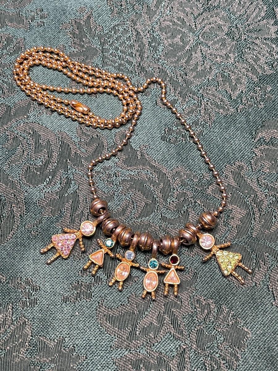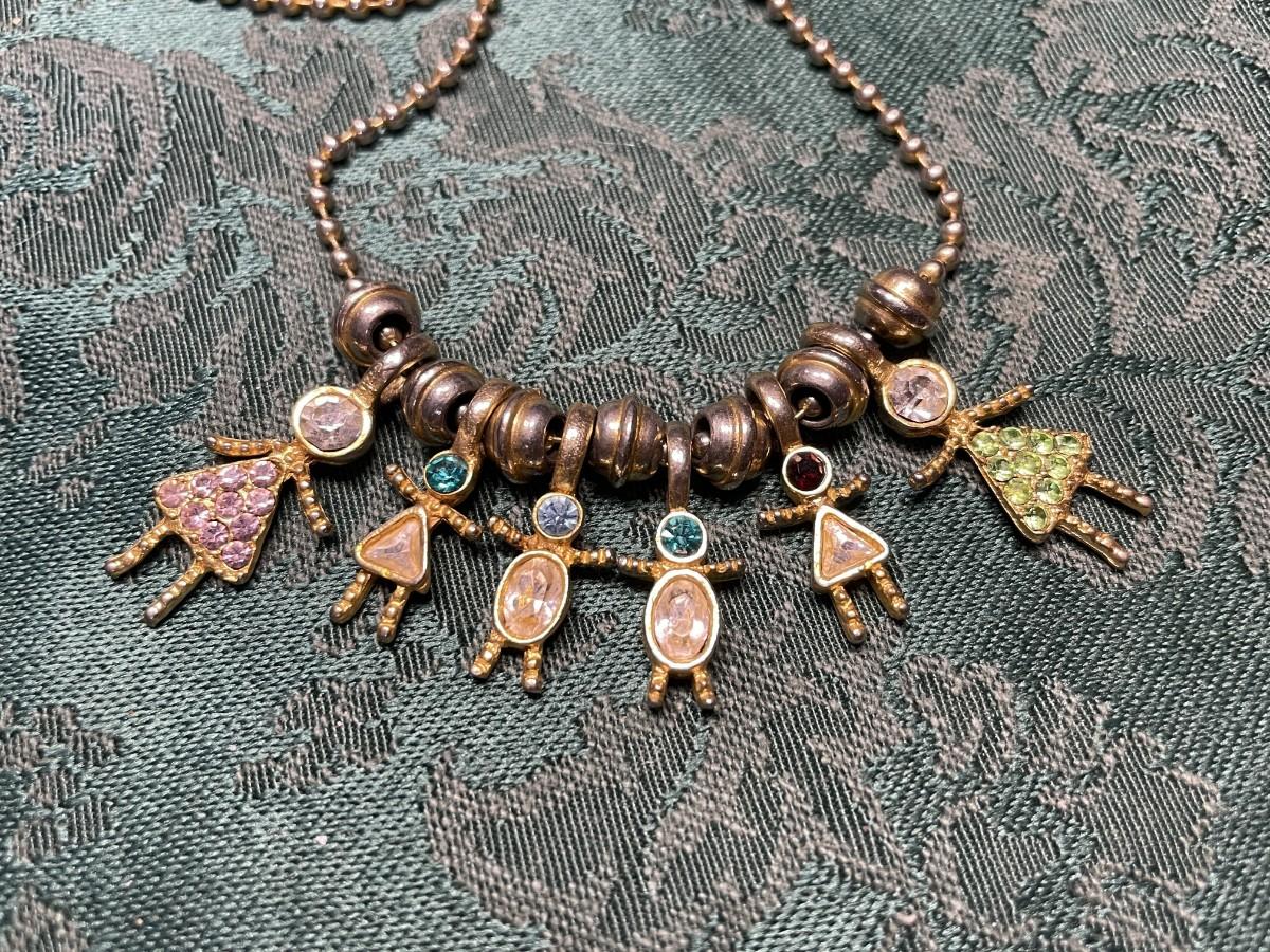 The necklace is a gold tone metal and about 28" long. There are two older girl charms, two little girl charms, and two little boy charms (daughters and grandchildren). Nothing is marked.