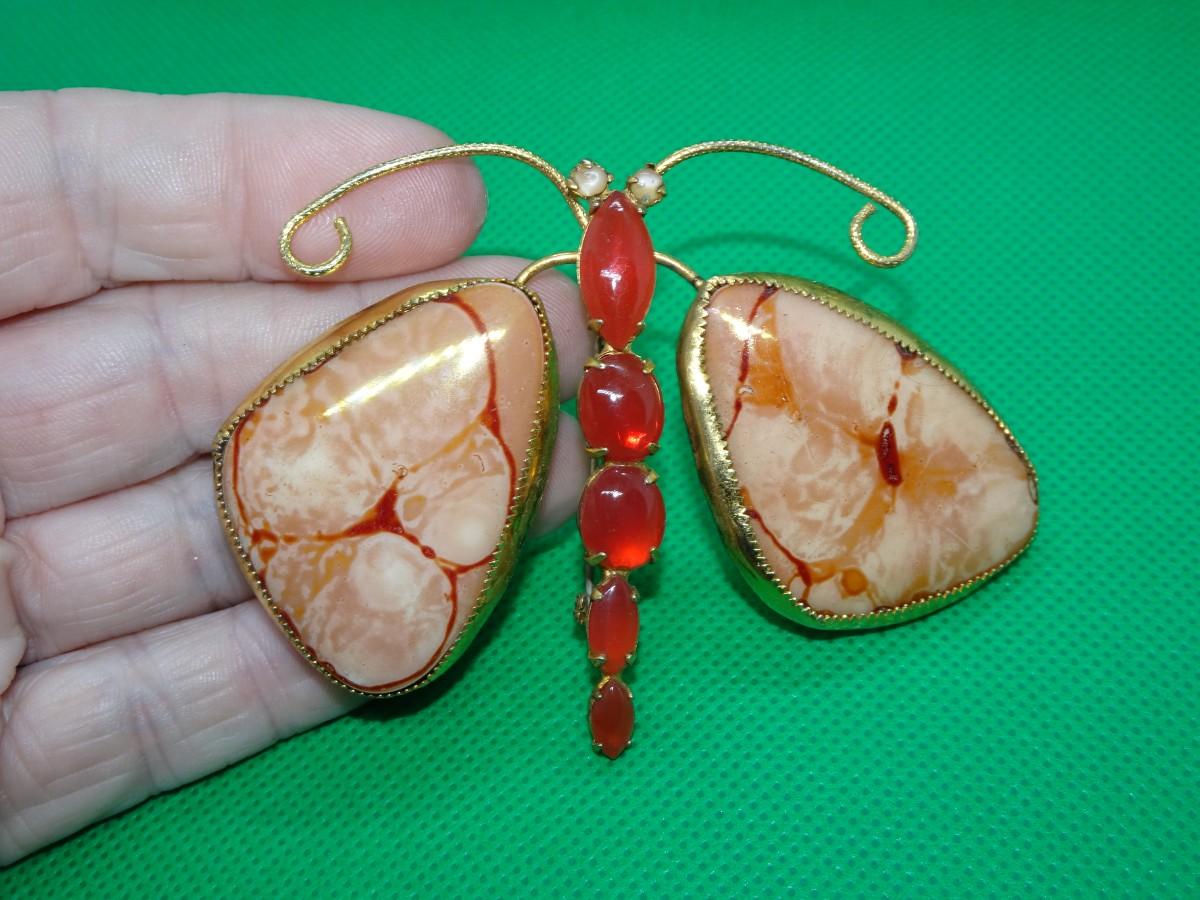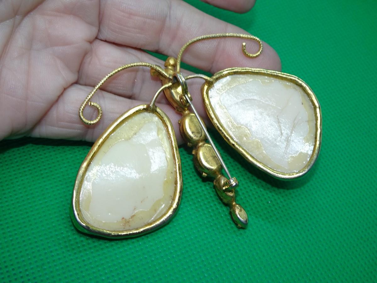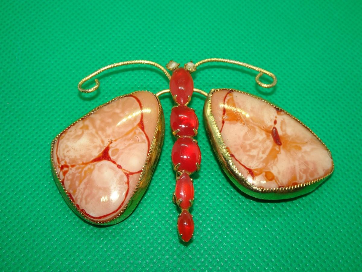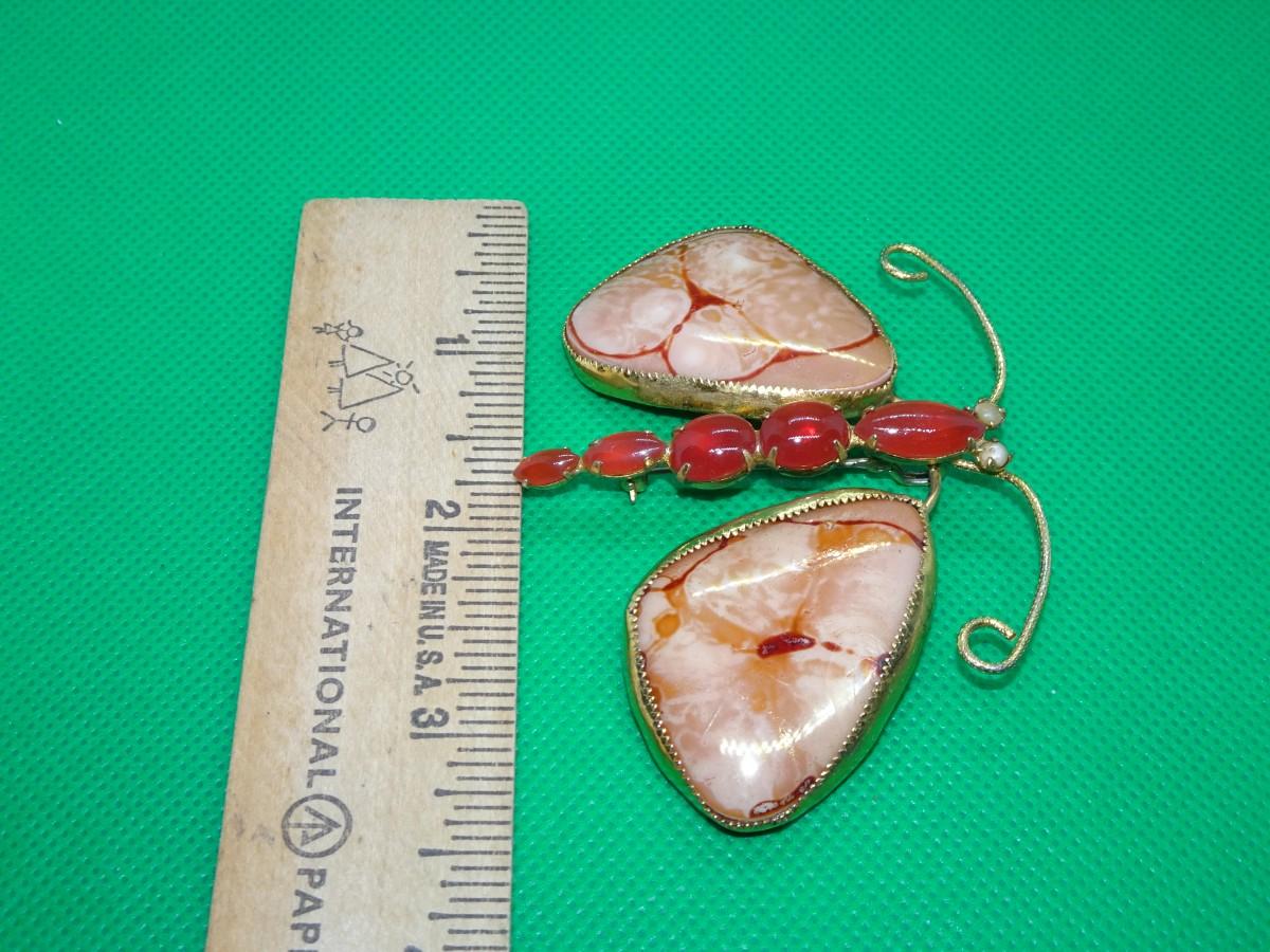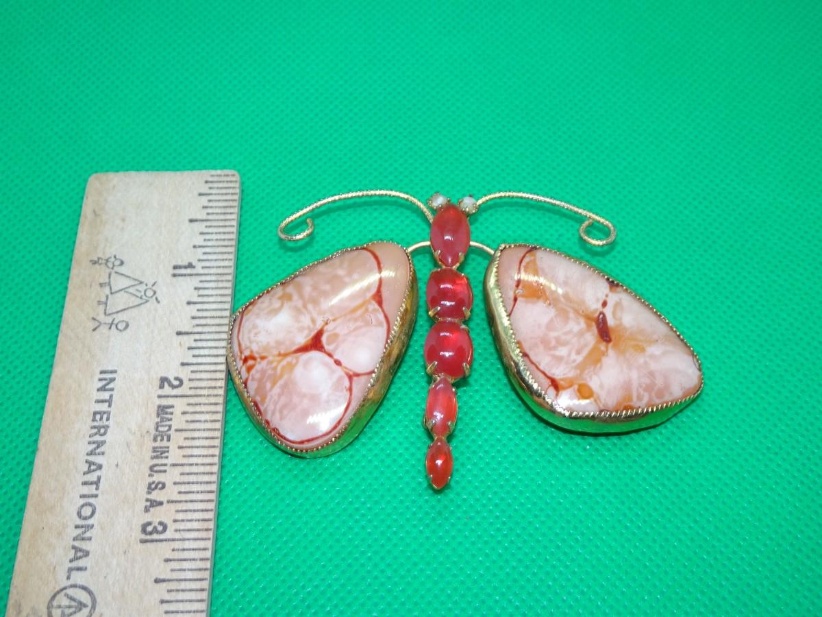 Gold Tone Faux Gem Stone Butterfly Pin, Handmade Craft Piece