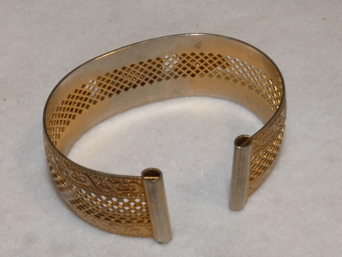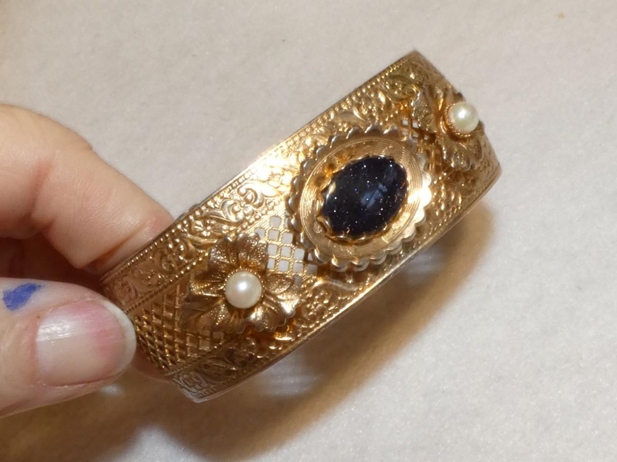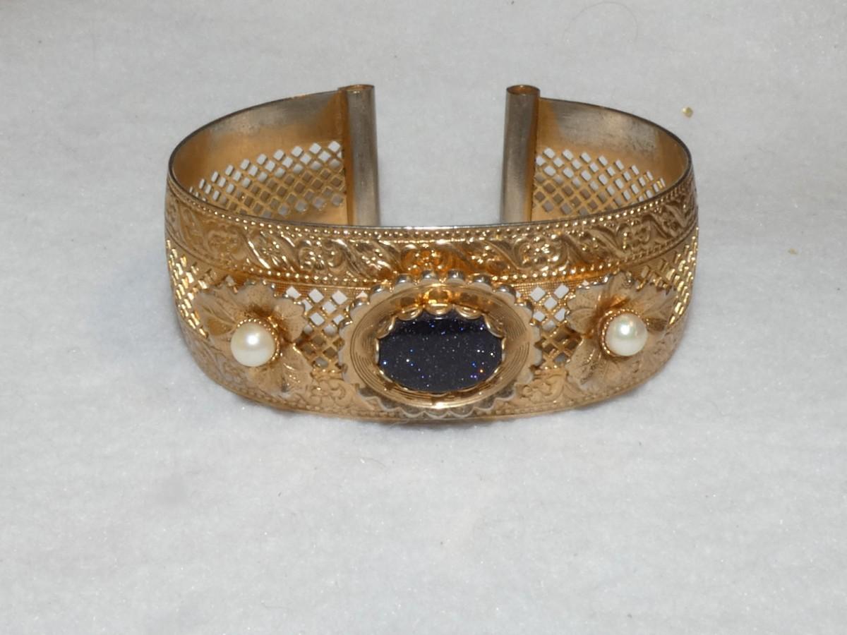 Gold Tone Filagree Cuff Bracelet, Speckled Stone w/Pearl accents