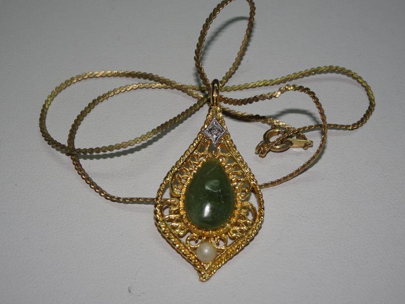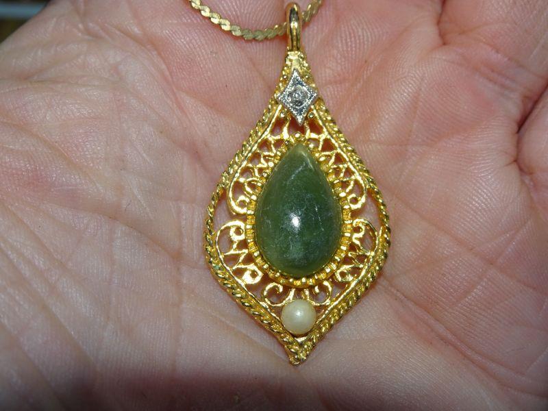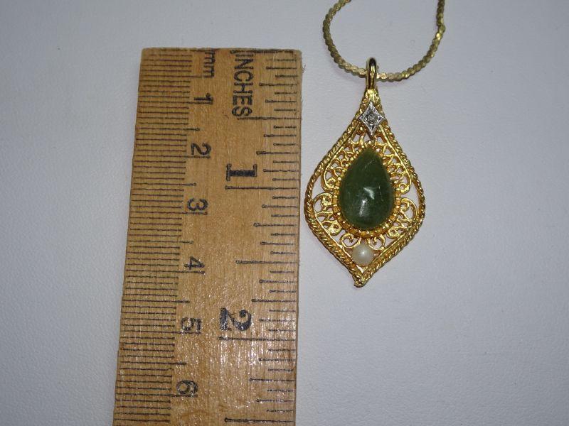 Gold Tone Filigree Jade Color Pearl Tear Drop Pendant
