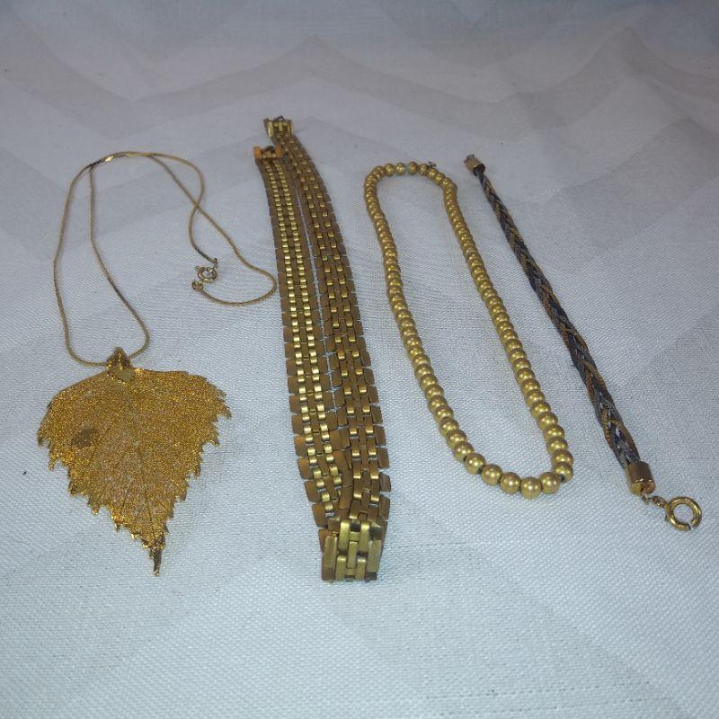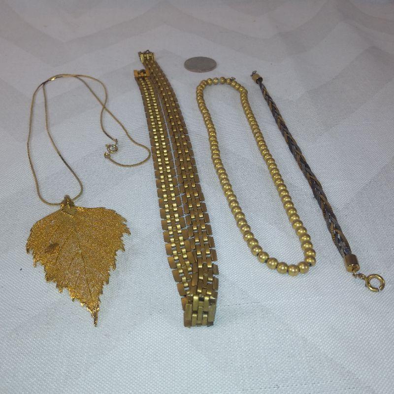 This auction lot is a grouping of 4 snappy items of Gold Tone Jewelry. First up is a Gold-dipped Leaf Necklace, then a heavy Box Chain Necklace, then a golden-colored Bead Necklace and last but not least is a Tri-colored Bracelet. All are in very good shape and ready for use.