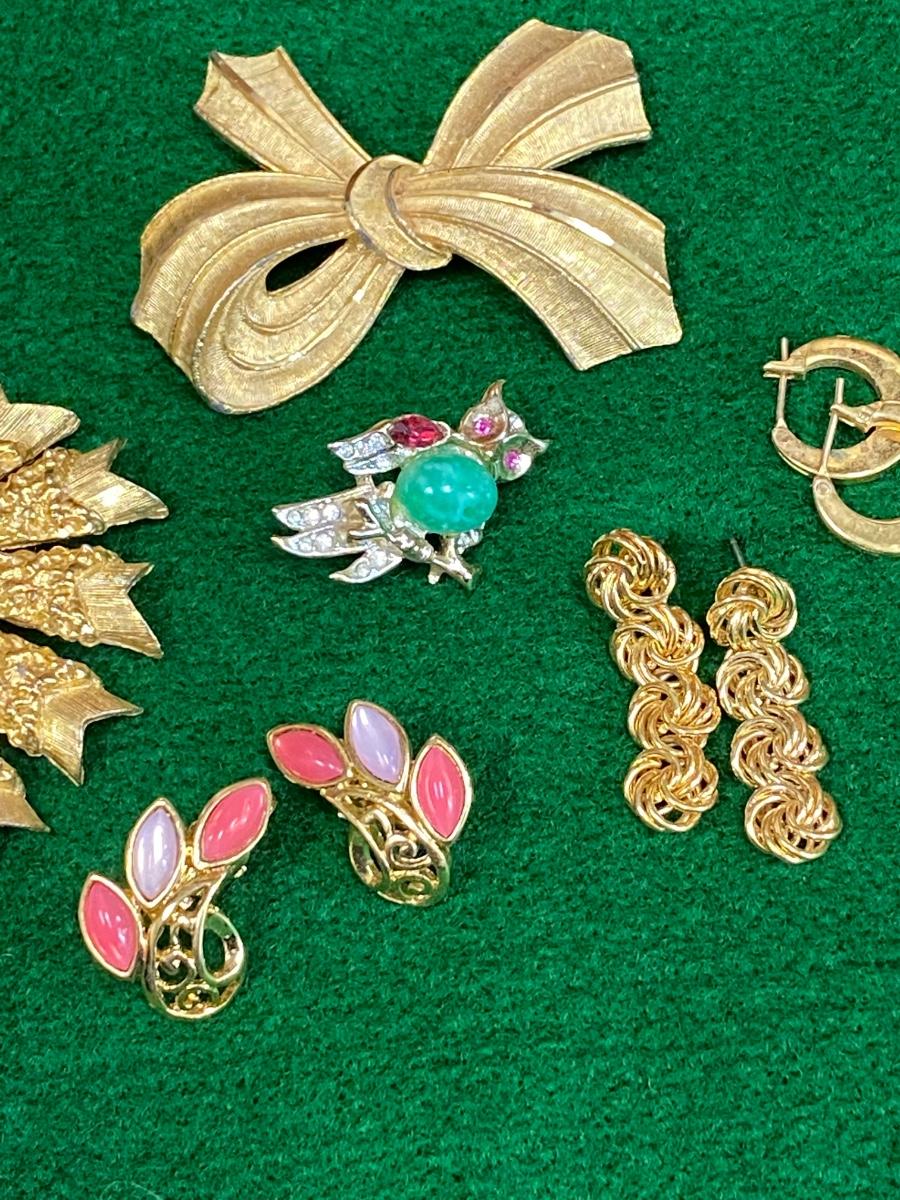 Gold Tone Jewelry Lot Brooches Pin Earrings. The pink earrings are clip style; the rest are for pierced ears.