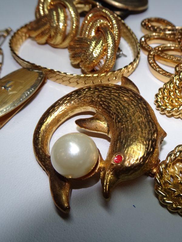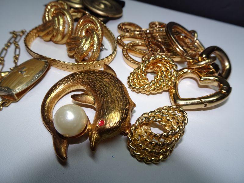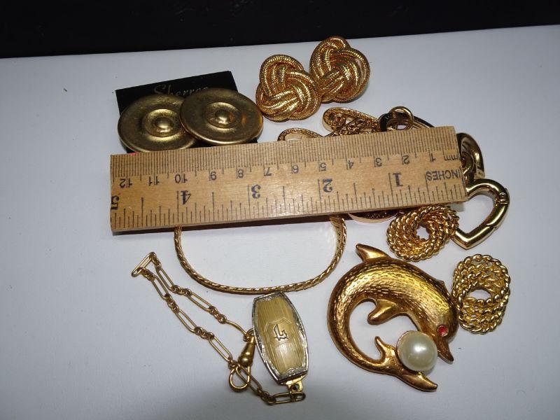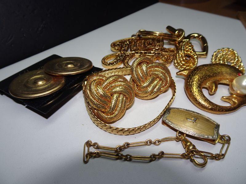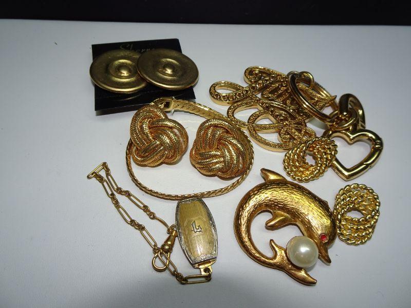 Gold Tone Jewelry Lot, Earrings, Bracelet, Key Ring, Watch Fob Chain, Brooch