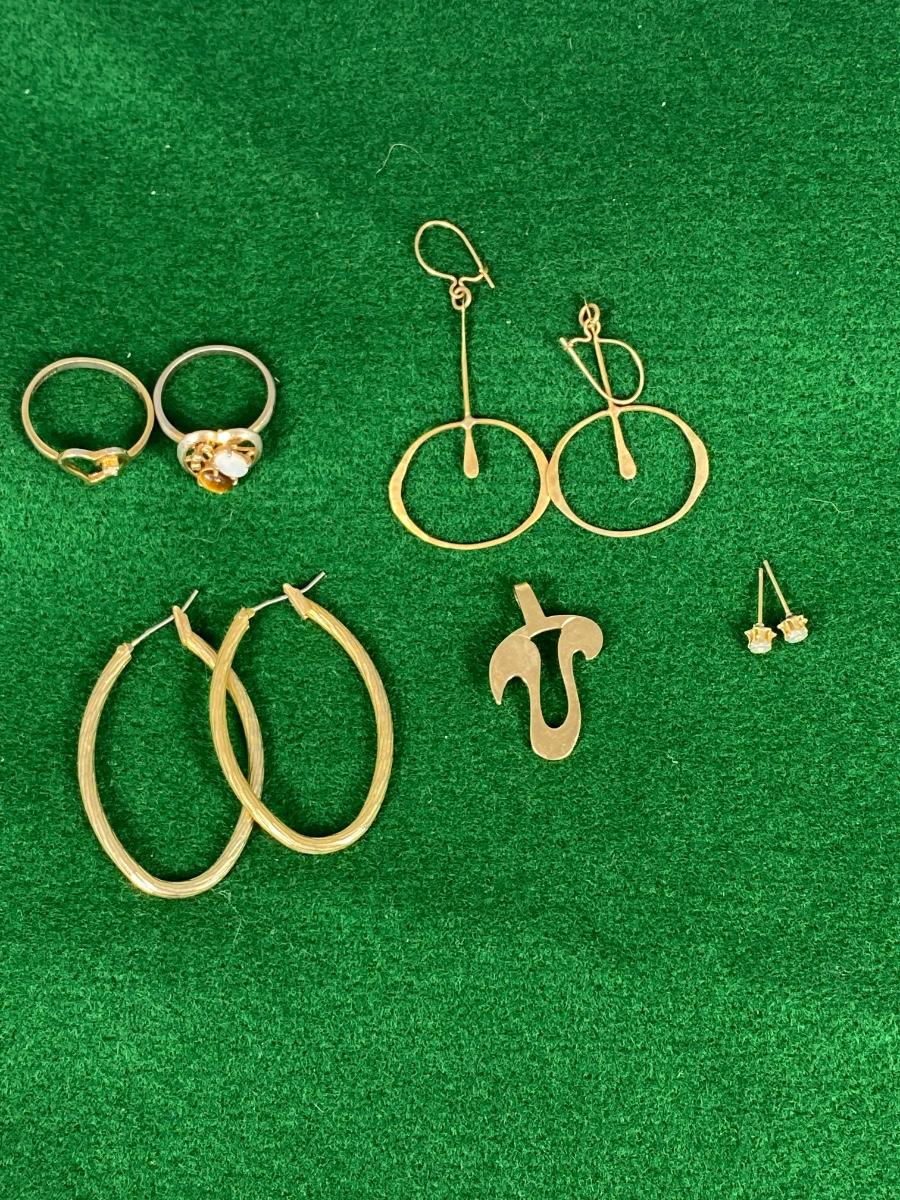 Gold tone jewelry lot. No gold markings on pieces. Rings have a little wear to the metal around the bottom of the band. Good worn condition on all pieces.