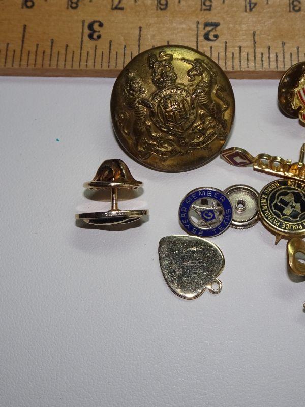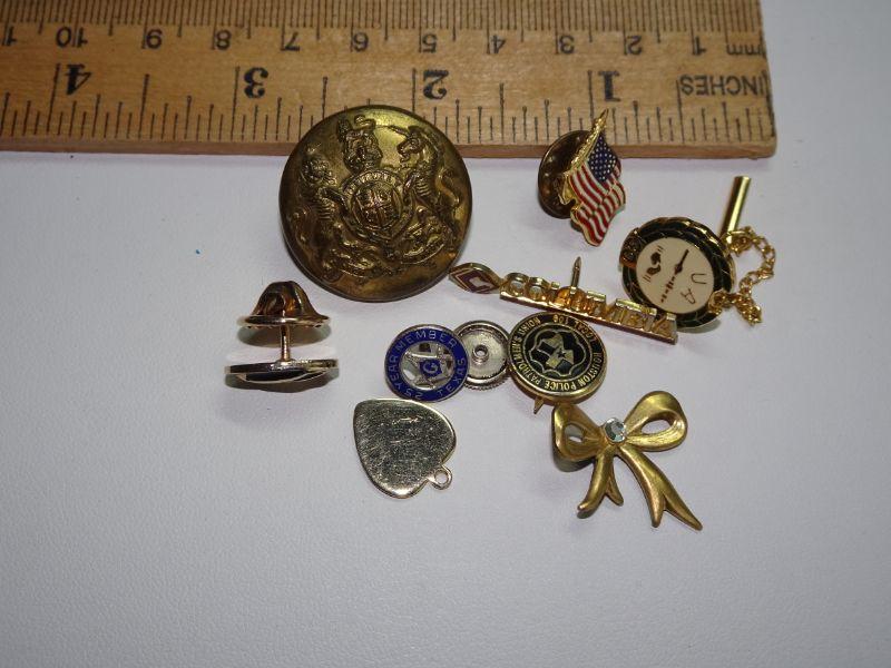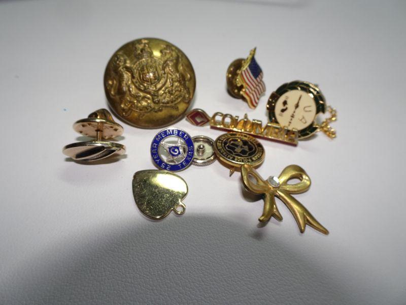 Gold Tone Jewelry Lot, Heart Charm, Fraternal, USA Flag Pin