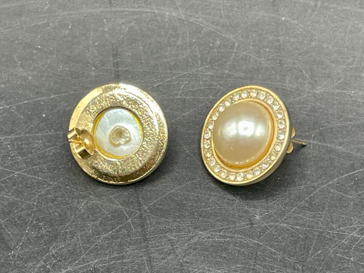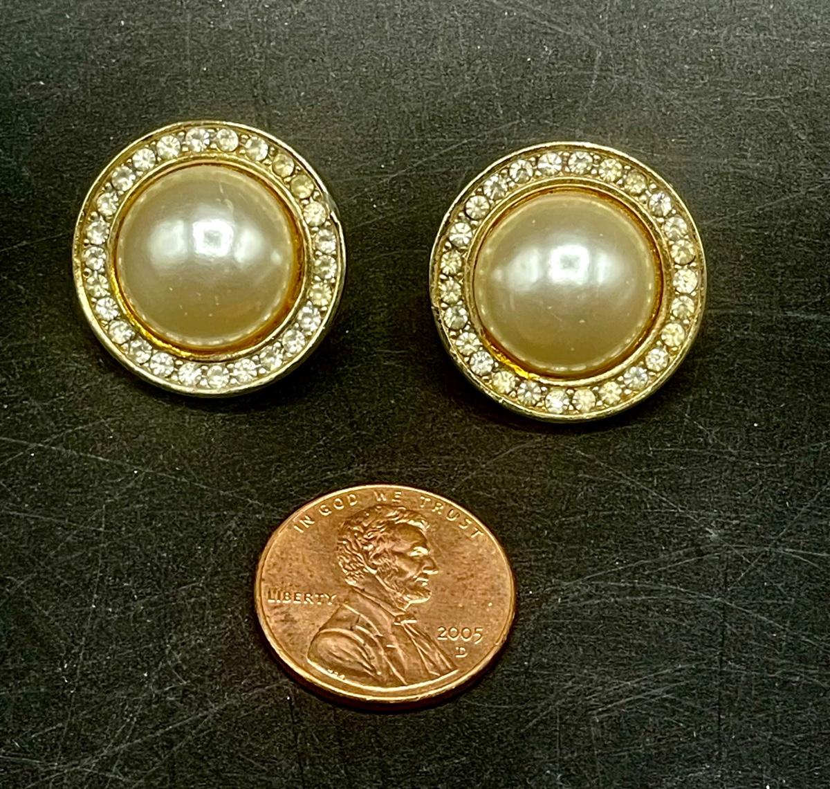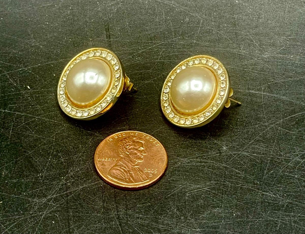 Gold Tone Large Faux Pearl Earrings with Rhinestones