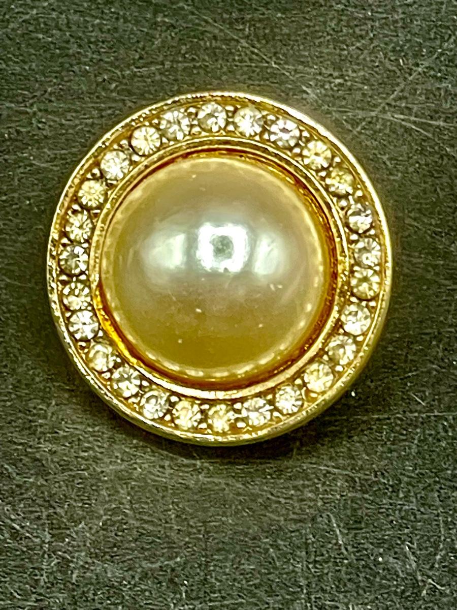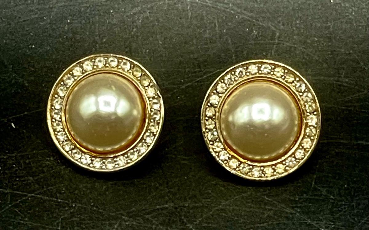 Gold Tone Large Faux Pearl Earrings with Rhinestones