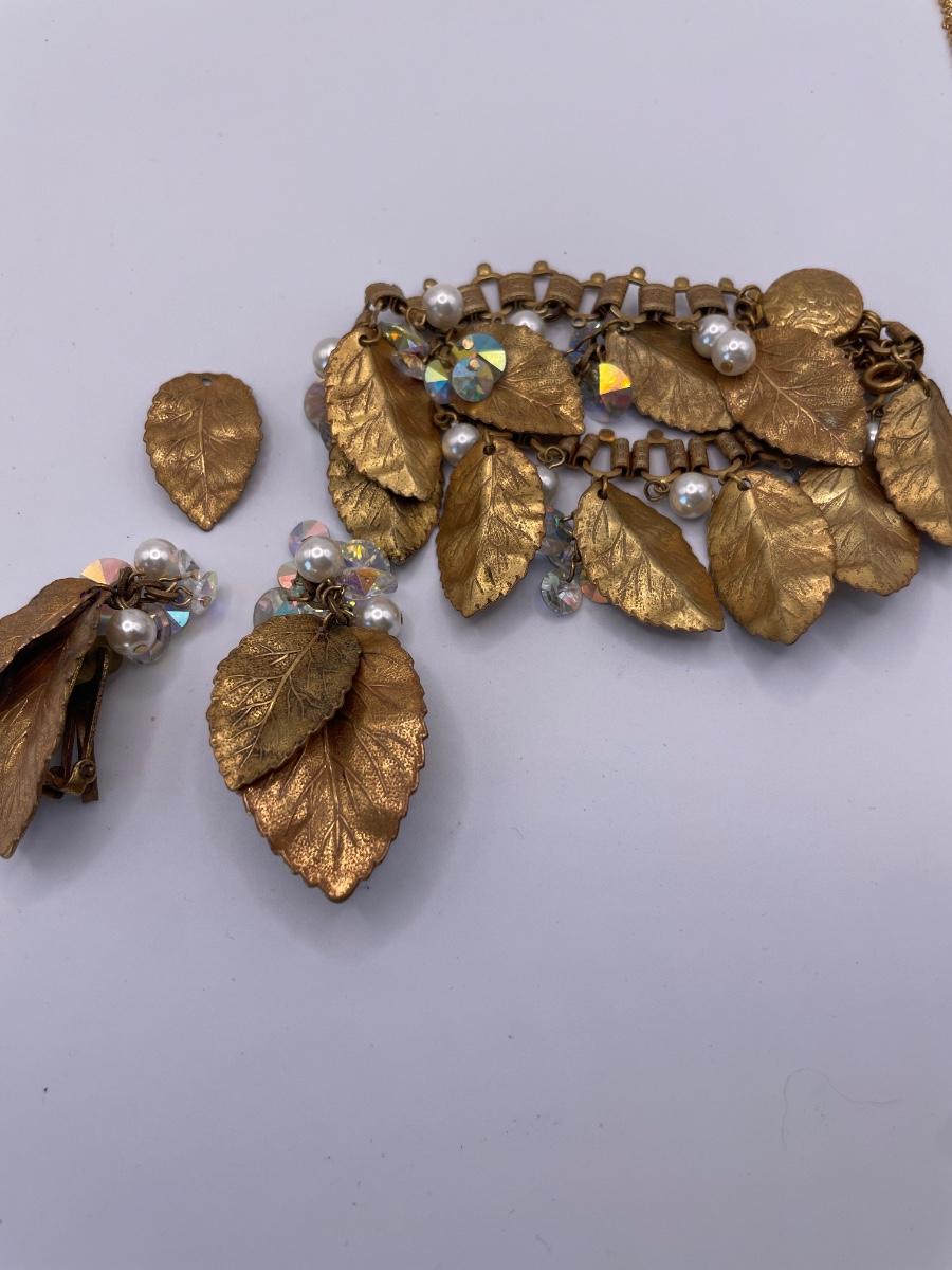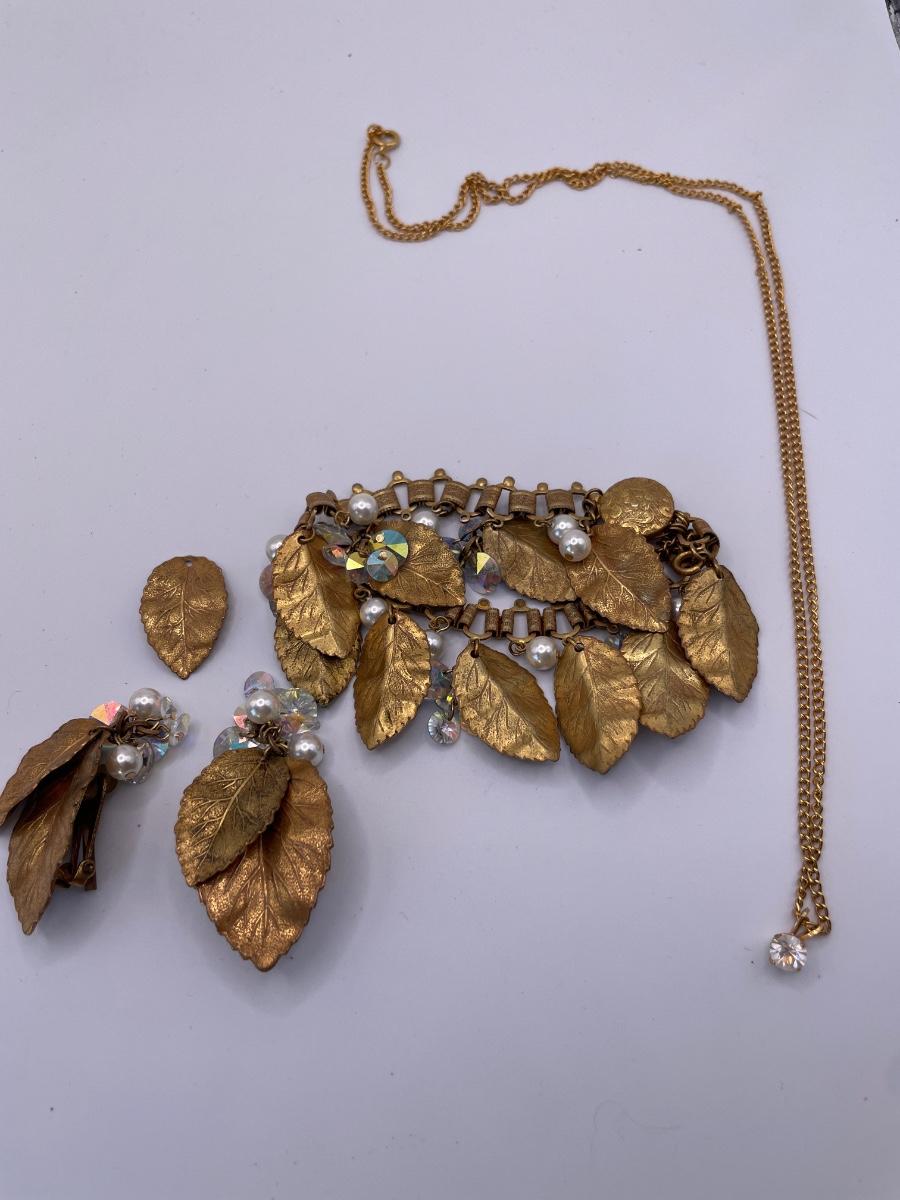 Gold tone leaf bracelet and clip ons with gold tone necklace