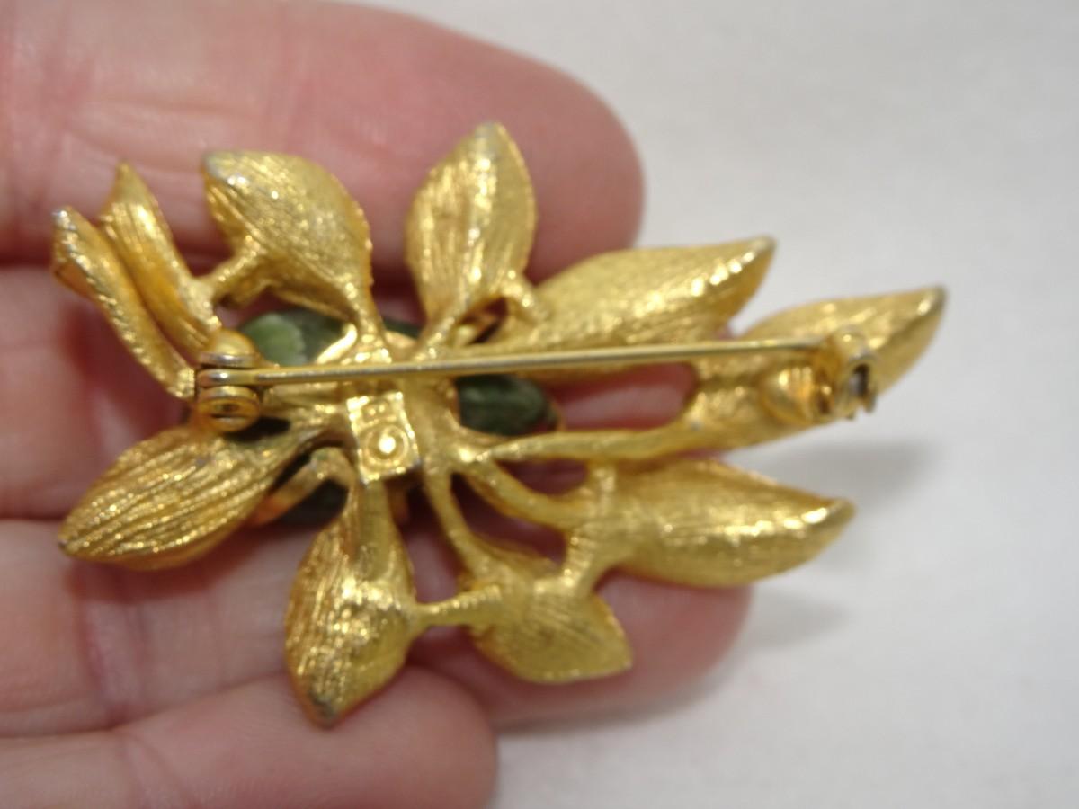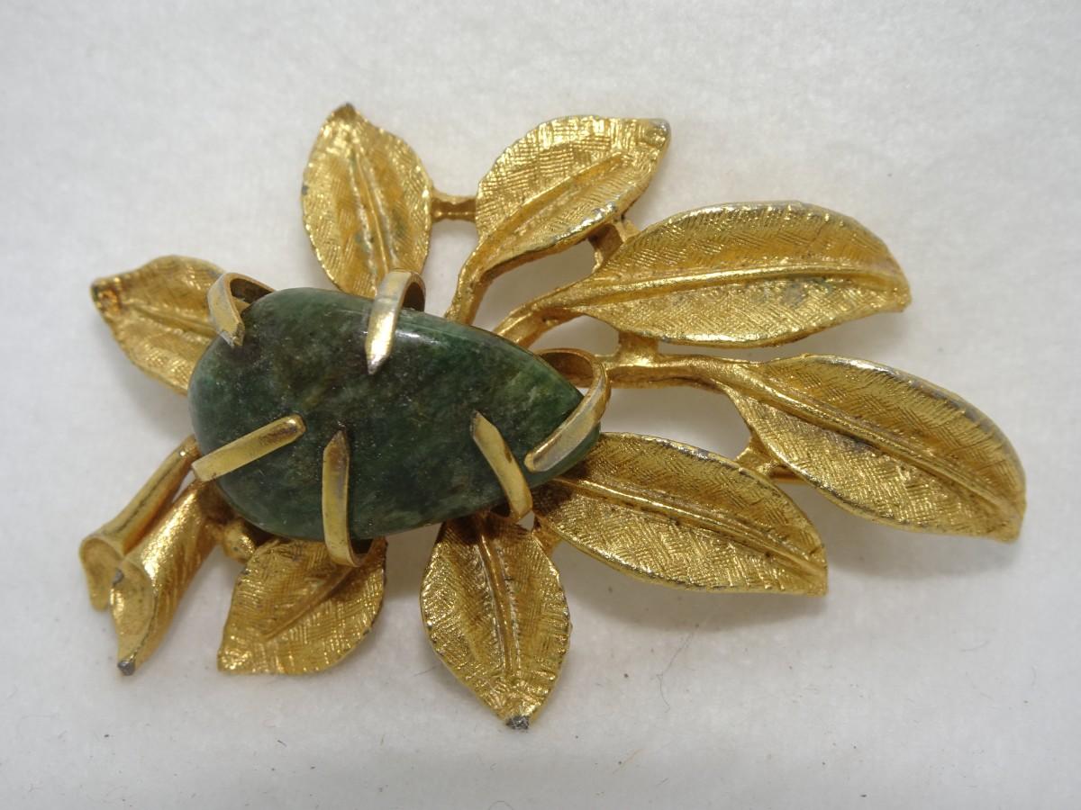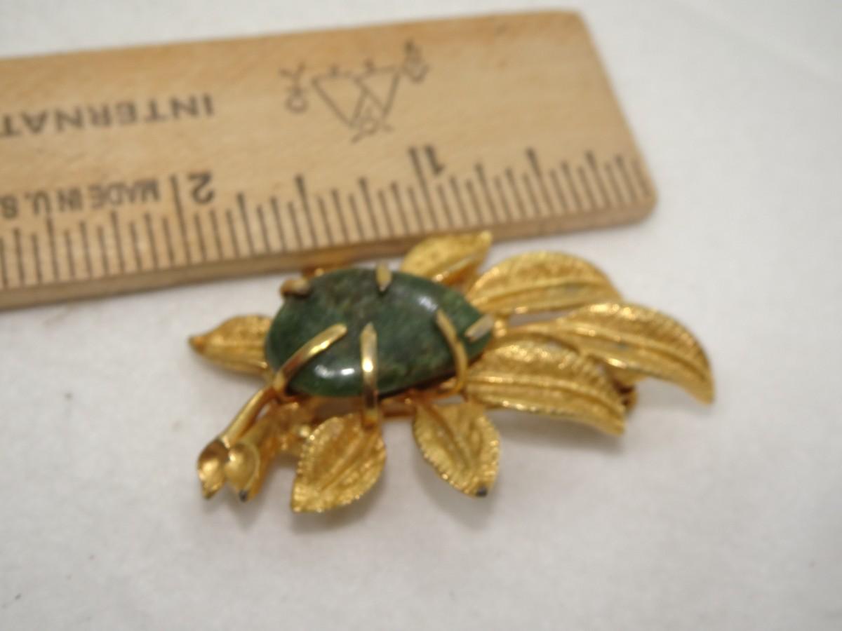 Gold Tone Mid Century Pin, Jade Stone Brooch