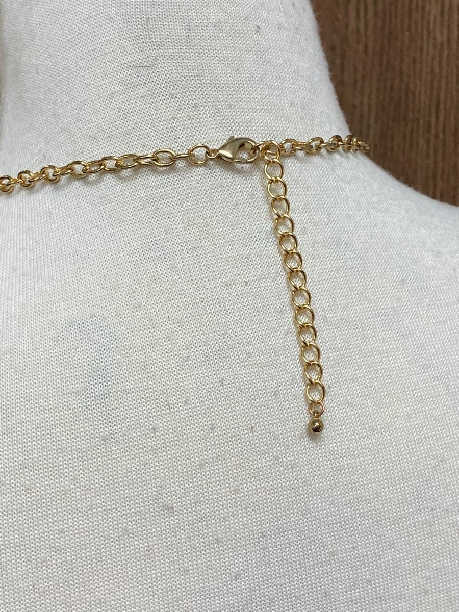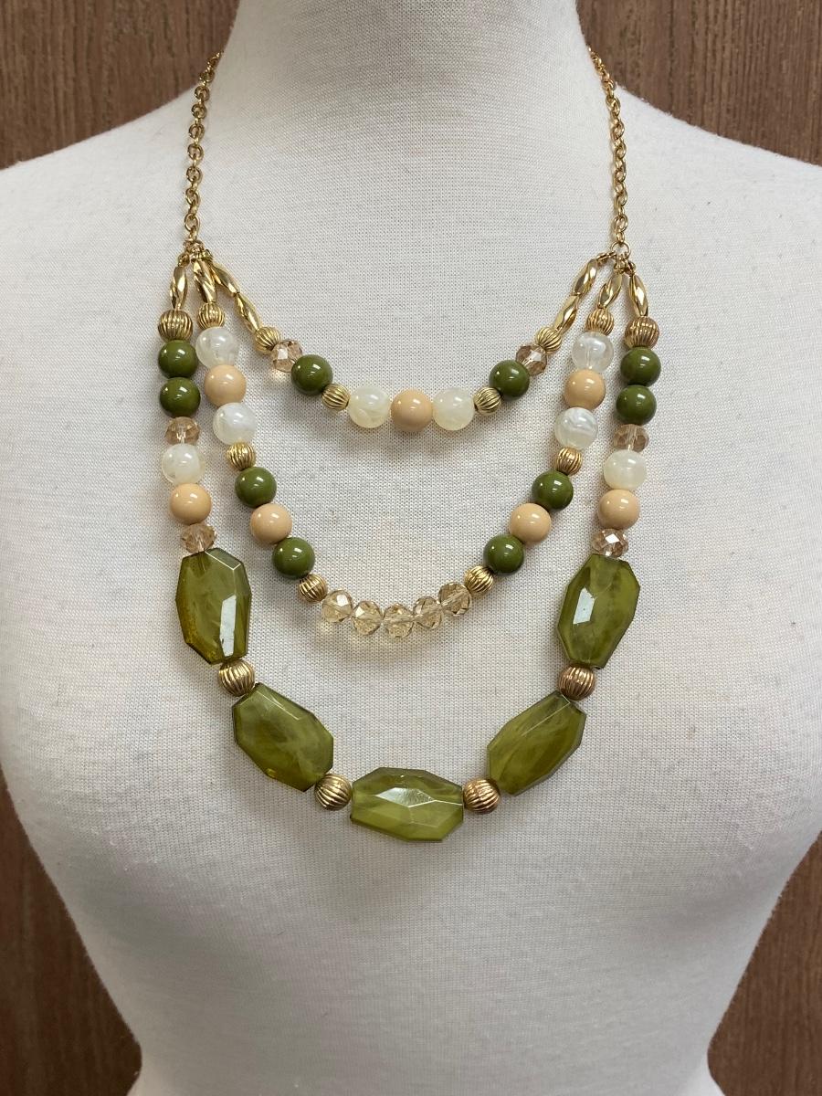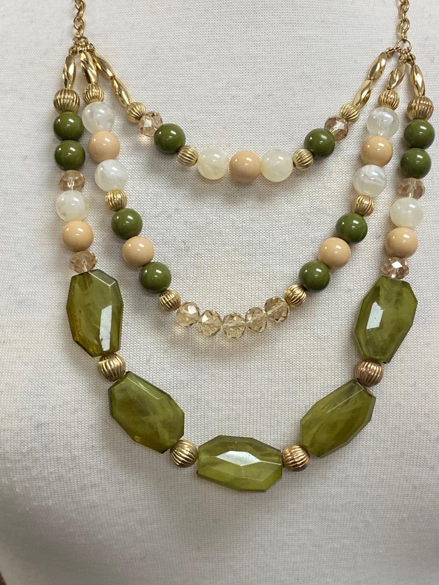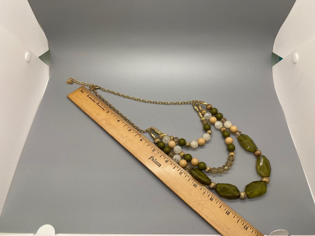 Gold tone beaded multistrand fashion necklace. Three strands with green, gold, and beige tone beads. Adjustable length. Good condition.
