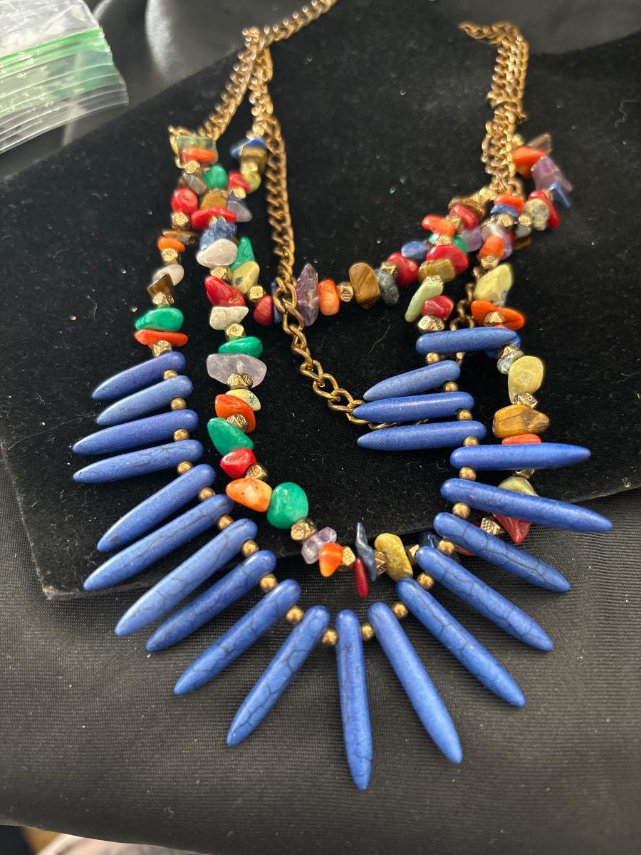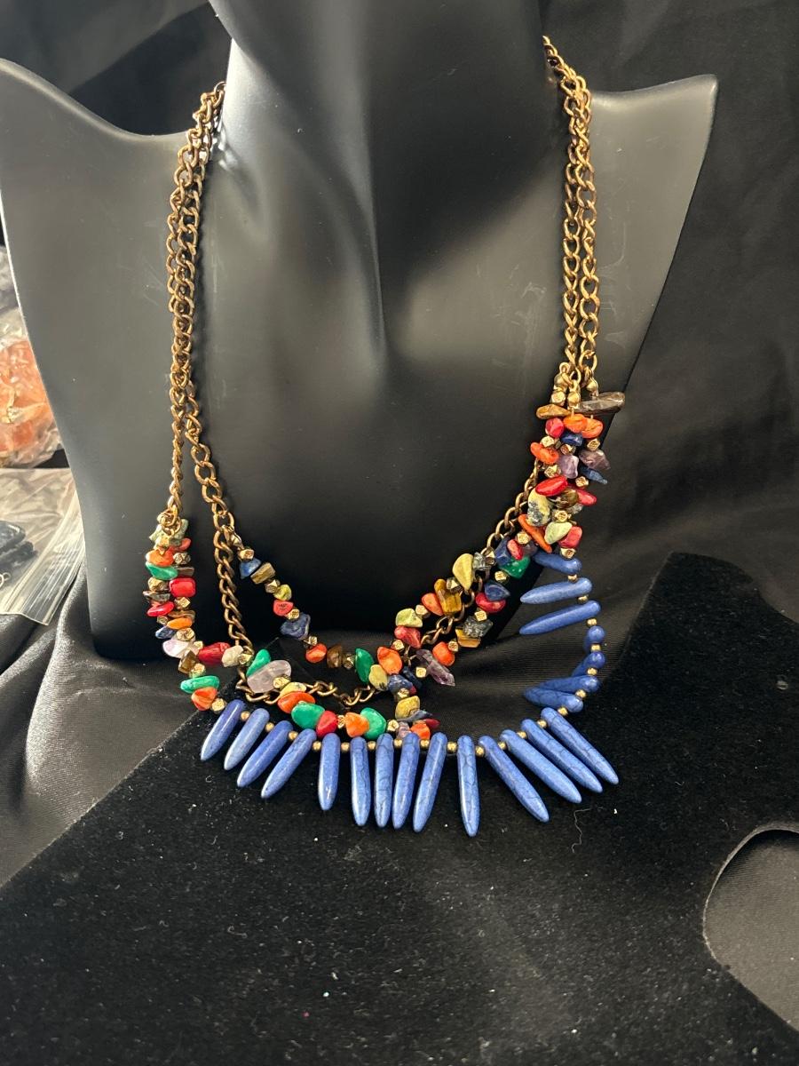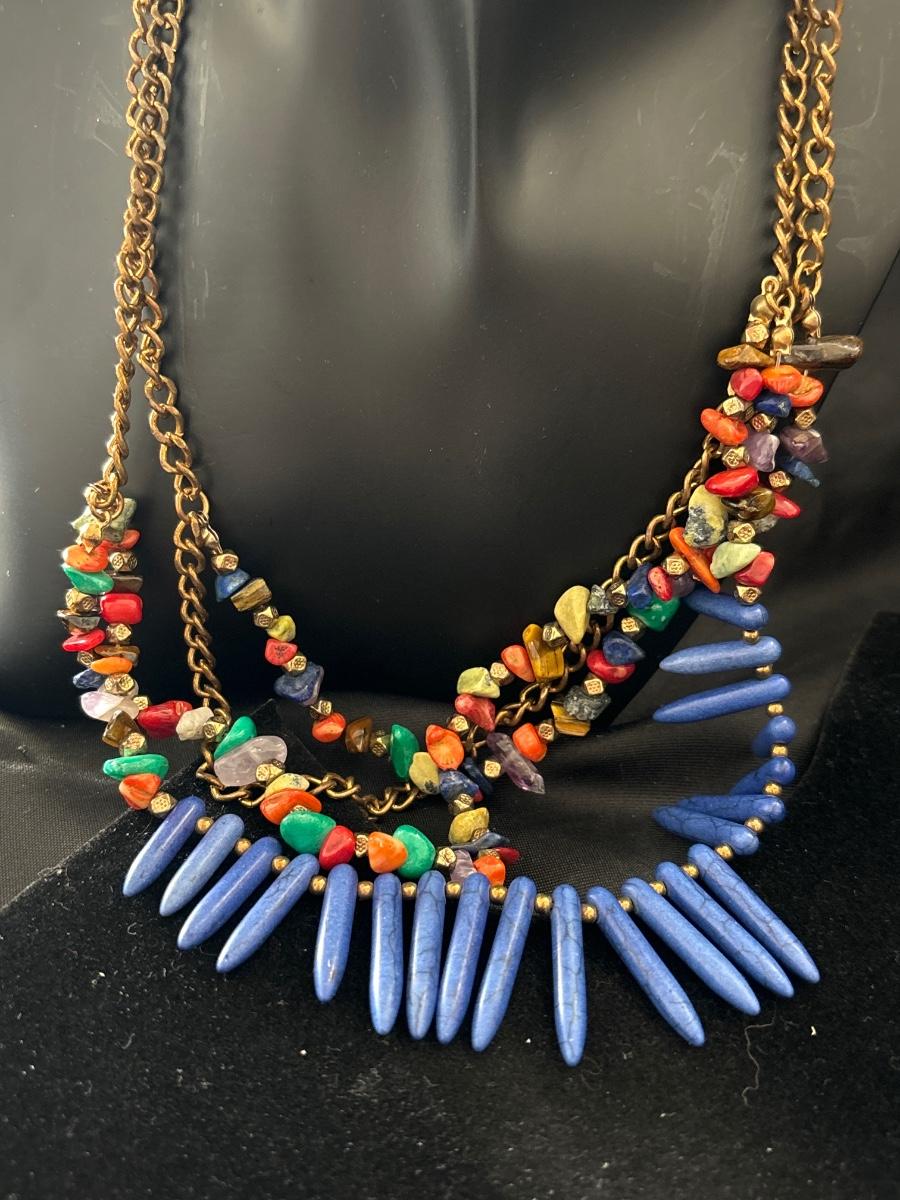 Gold tone necklace with colorful beaded and stone charms