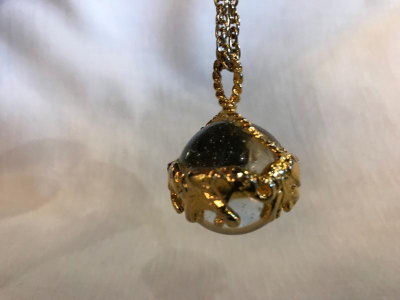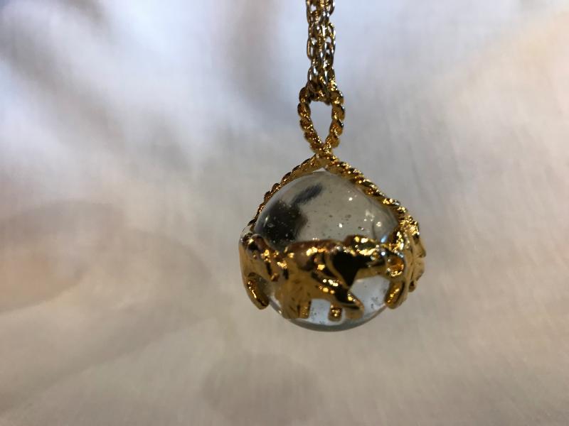 Heavy gold tone chain holds bubble glass sphere pendant surrounded by train of elephants.