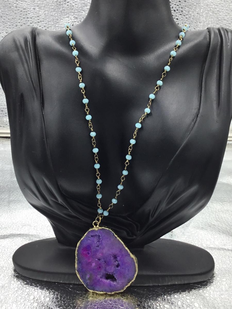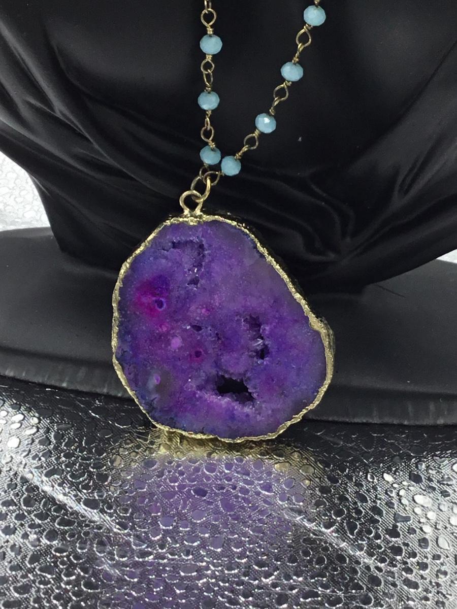 Gold tone necklace with purple stone pendant