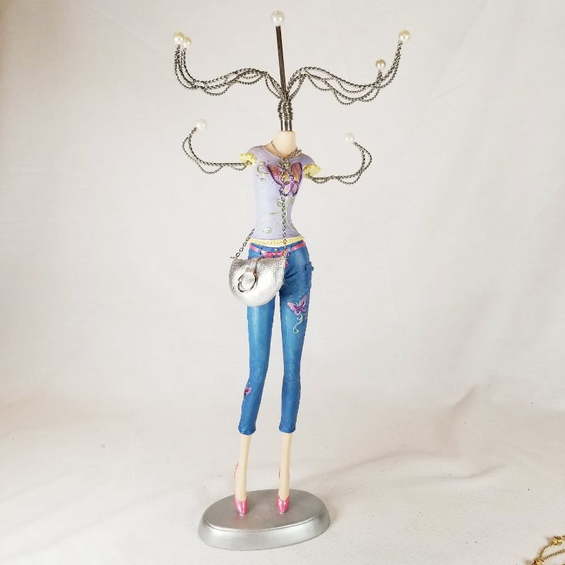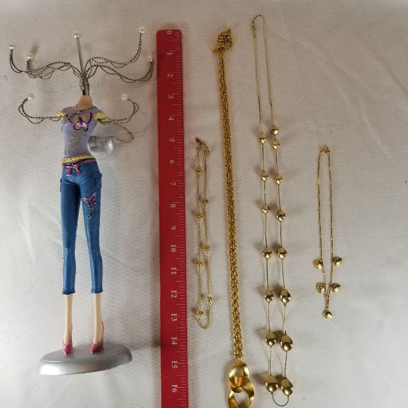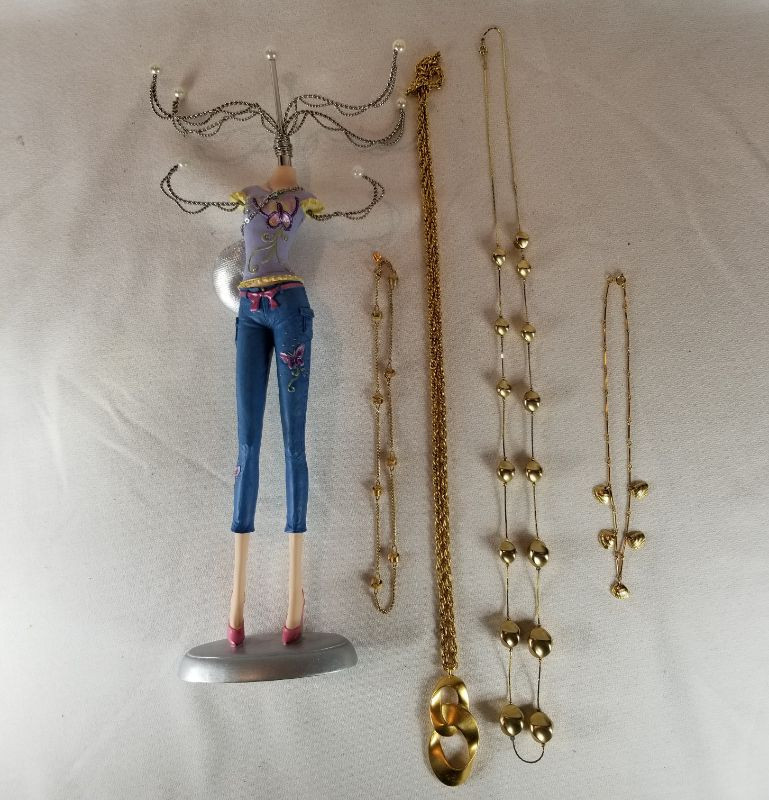 A very nice selection of gold tone necklaces plus a whimsical girl jewelry holder. All chains are bright and shiny, all clasps are in good working order. All items are in very good condition. The jewelry holder is 14-1/2-inches tall.