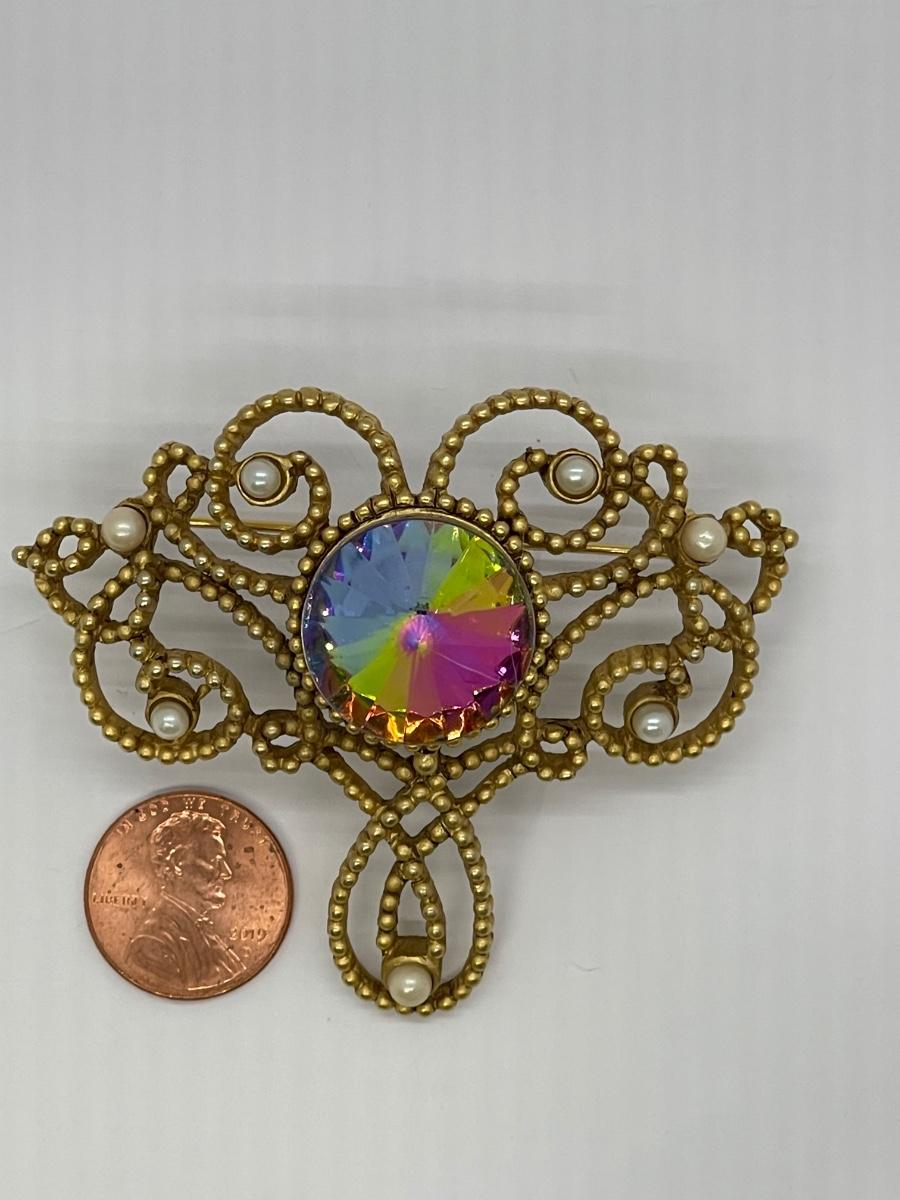 Gold Tone Open Work Victorian Styled Brooch with Large Watermelon Rhinestone Center. Faux pearl accents. In good condition.