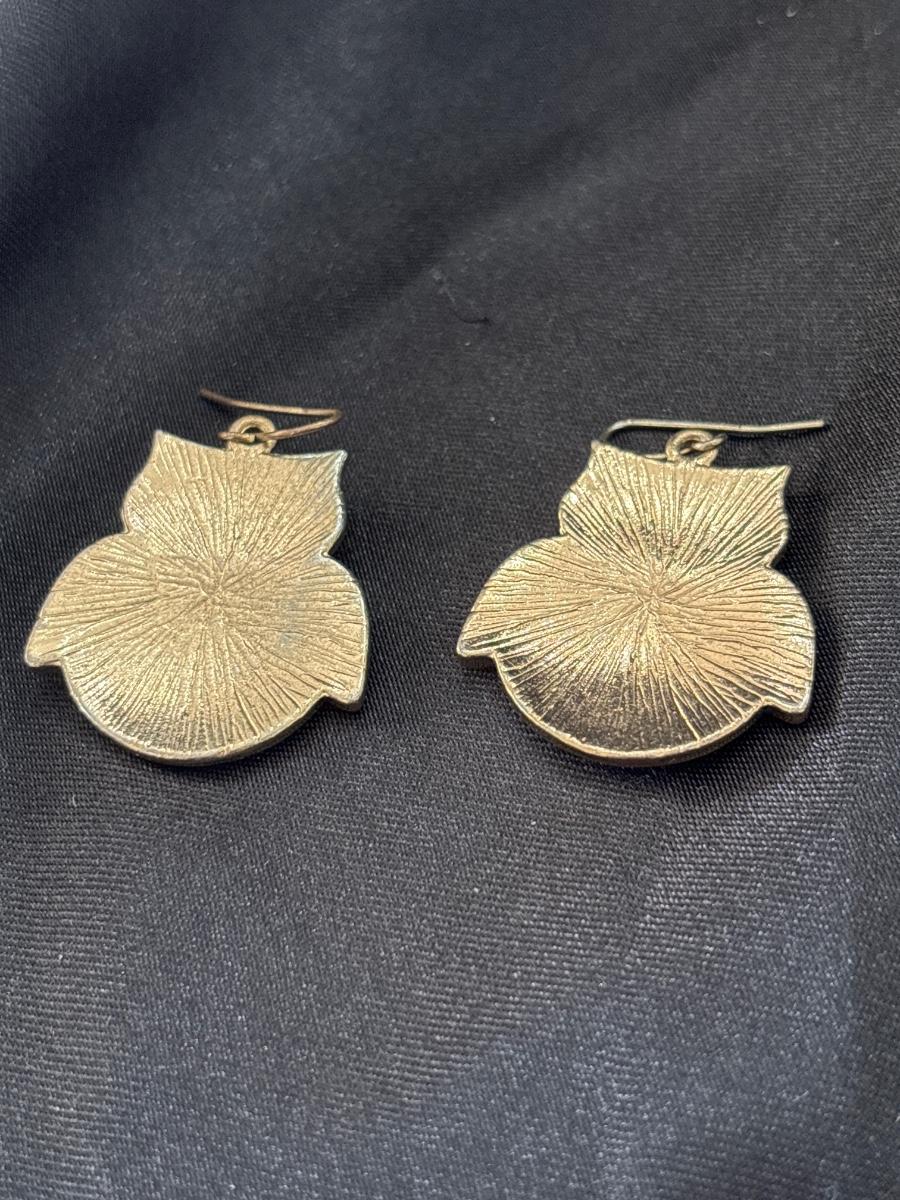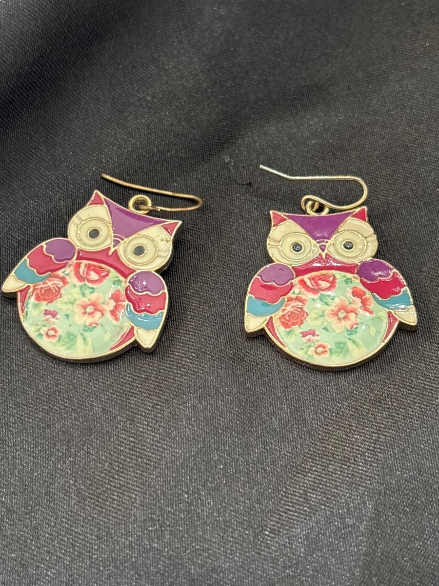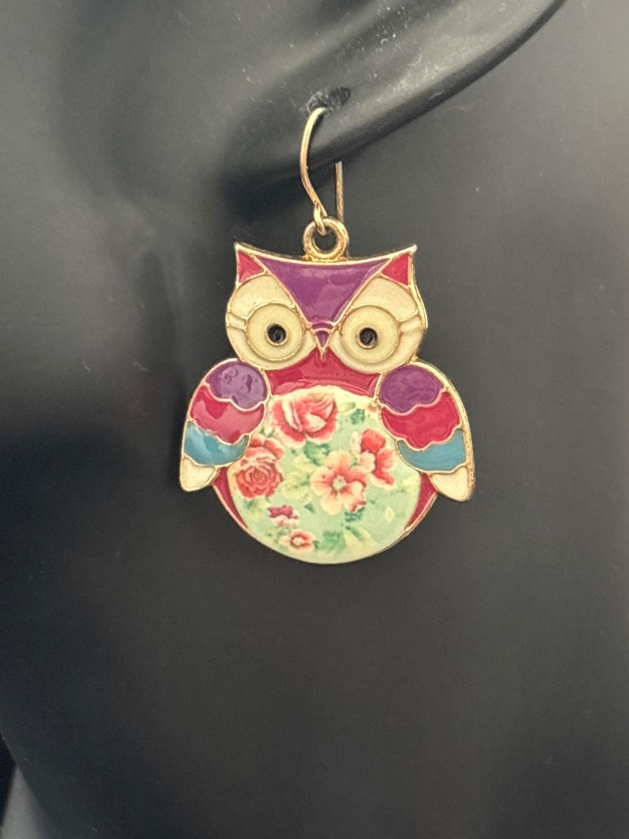 Gold tone owl earrings with floral middle