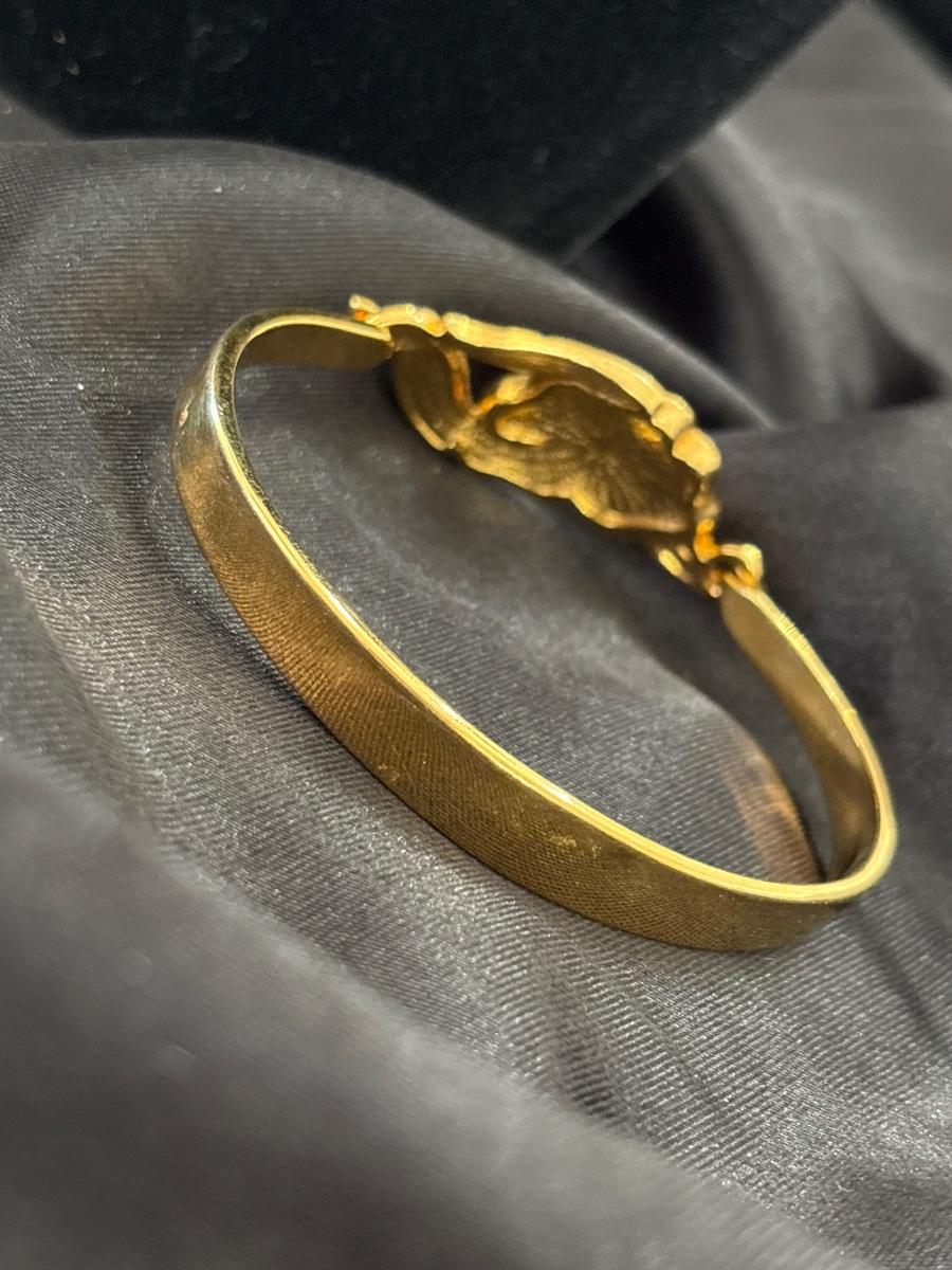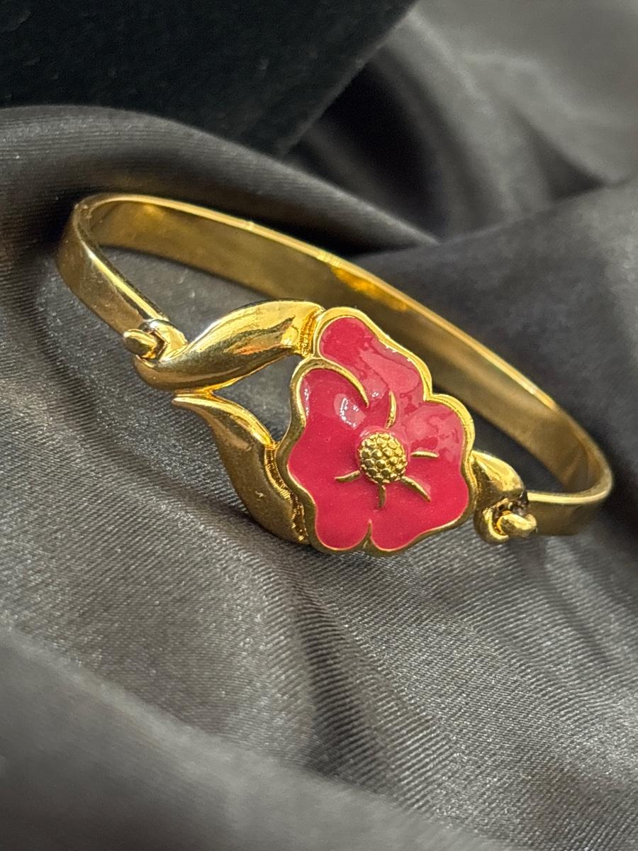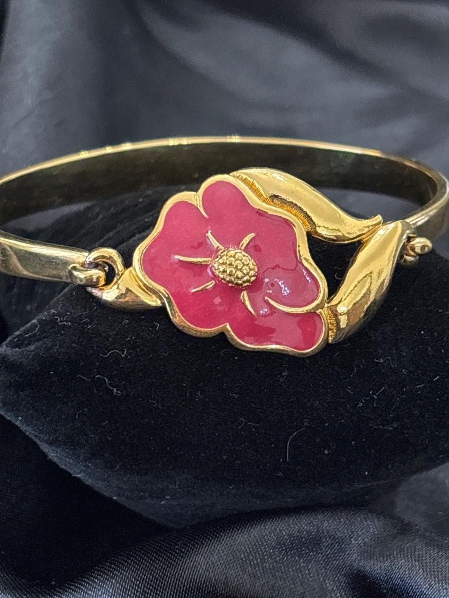 Gold Tone Pink Hibiscus Flower Bangle Bracelet EUCGold