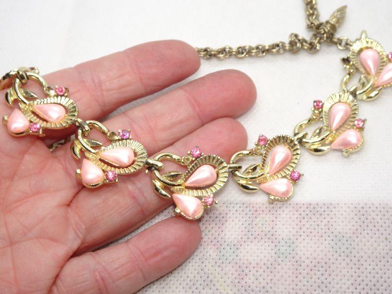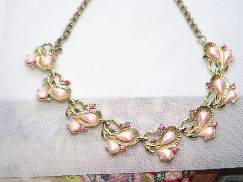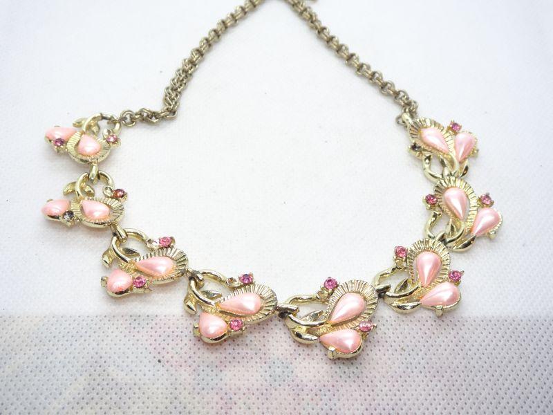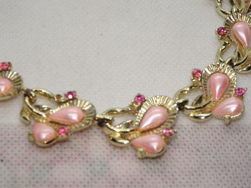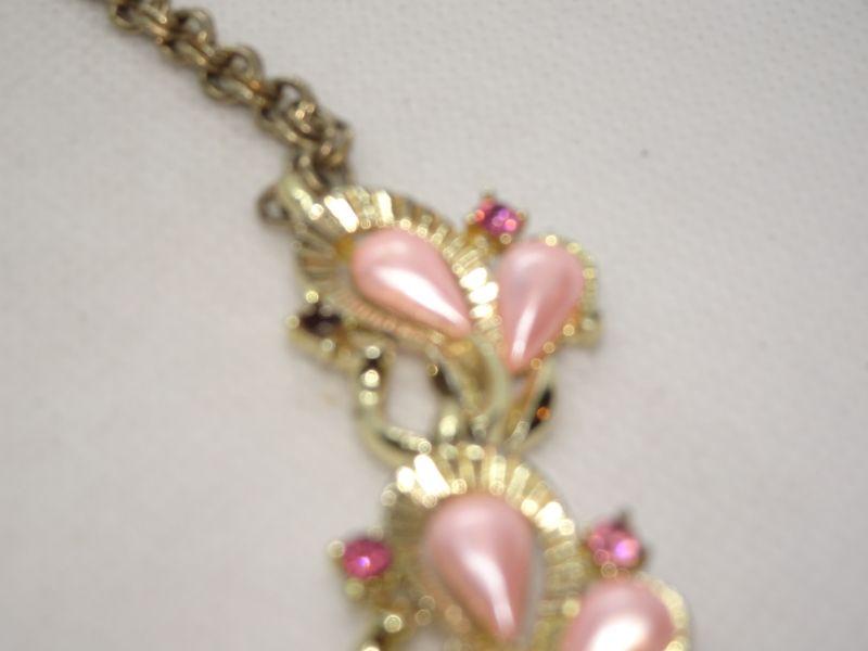 Gold Tone Pink Pearl & Rhinestone Mid Century Necklace