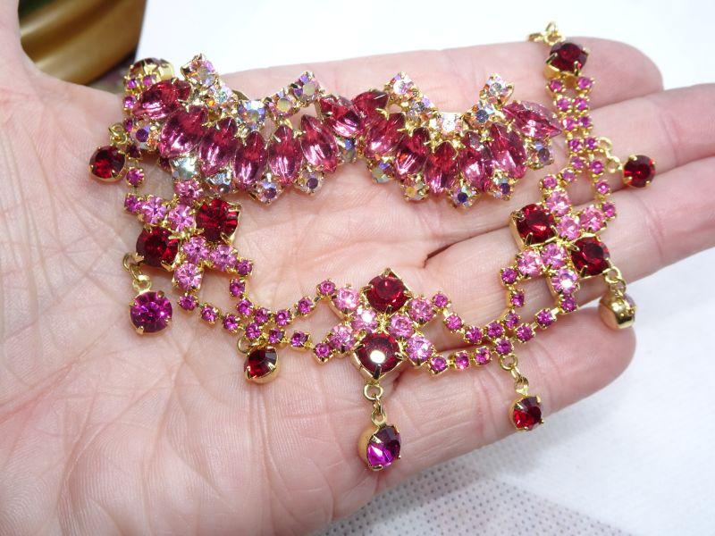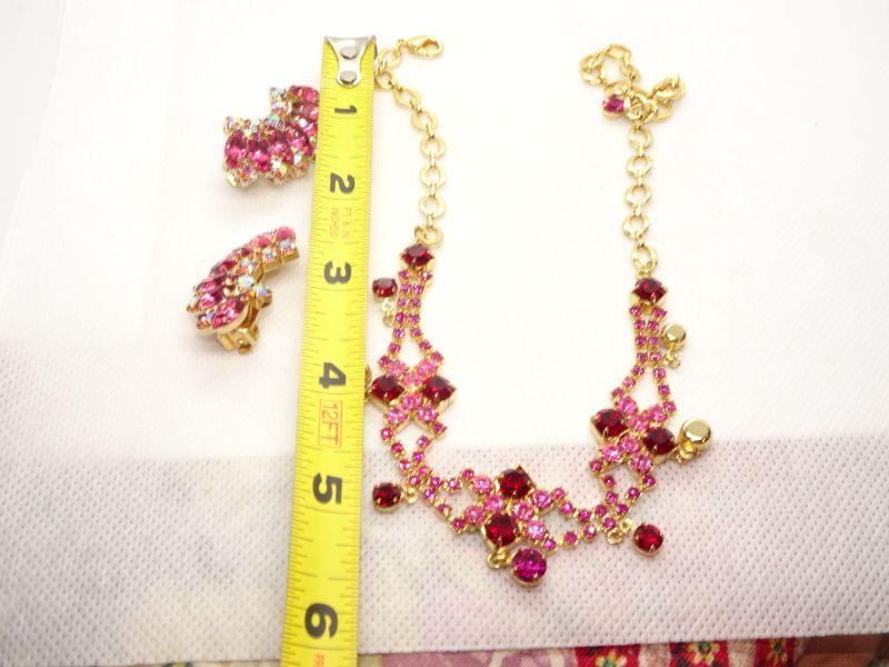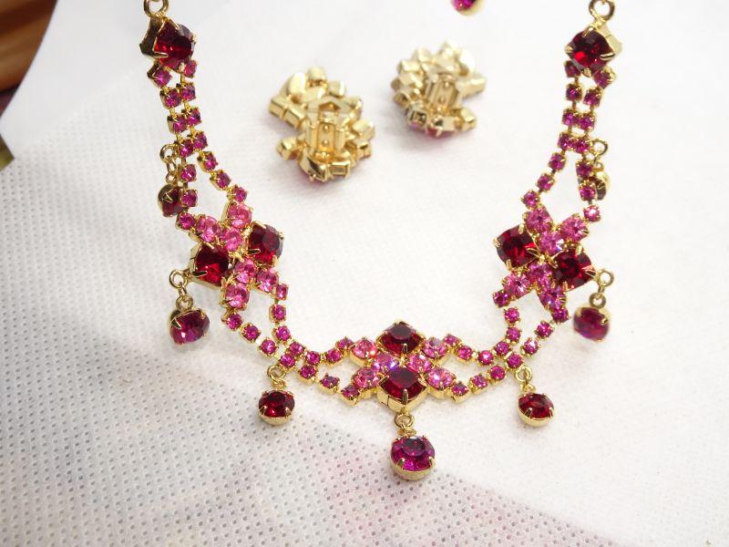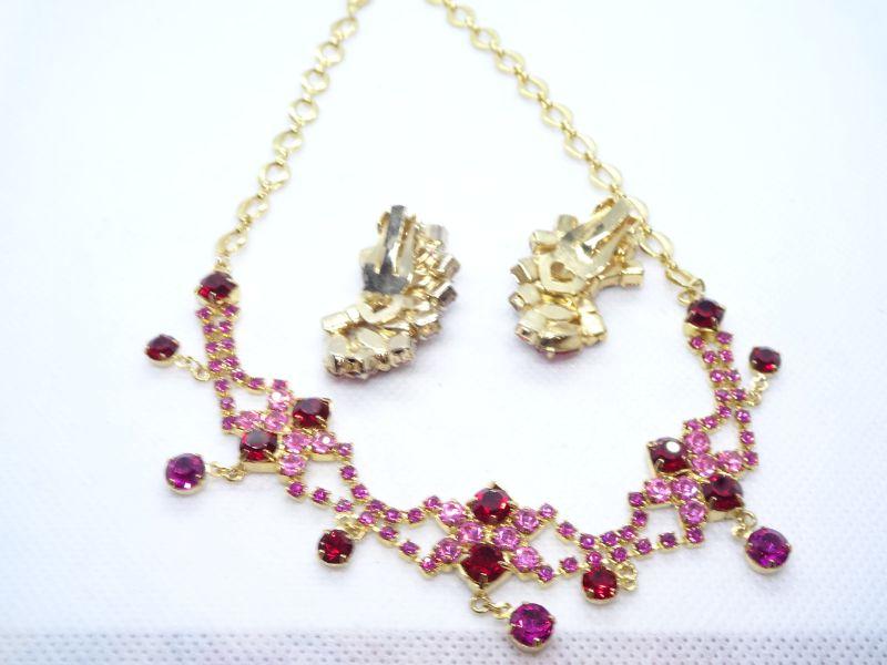 Gold Tone Pink & Red Rhinestone Mid Century Necklace & Clip Earrings - Reserve