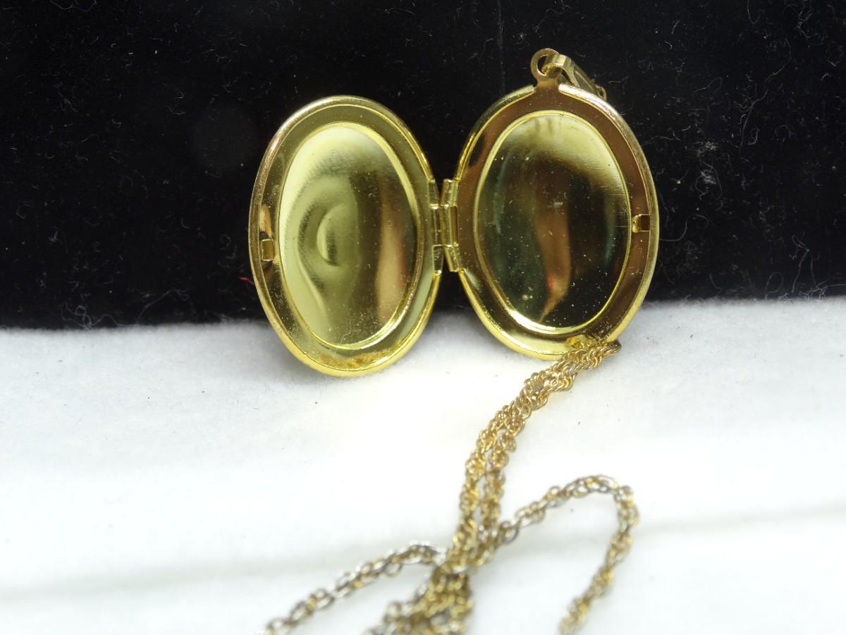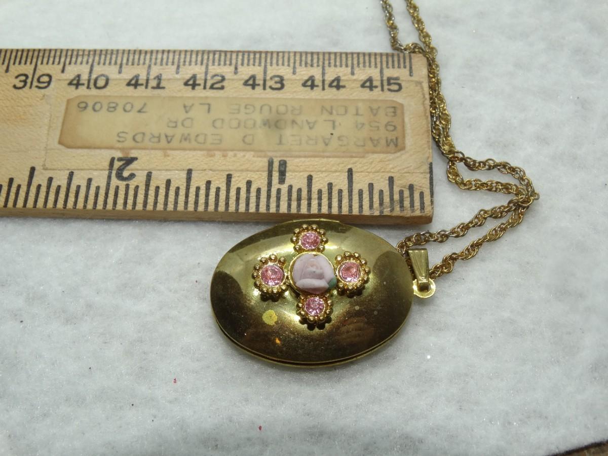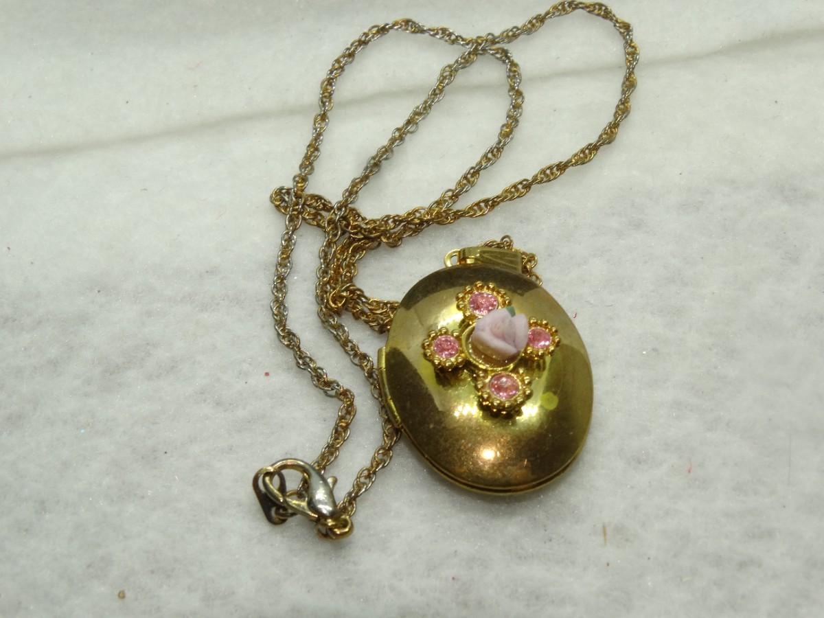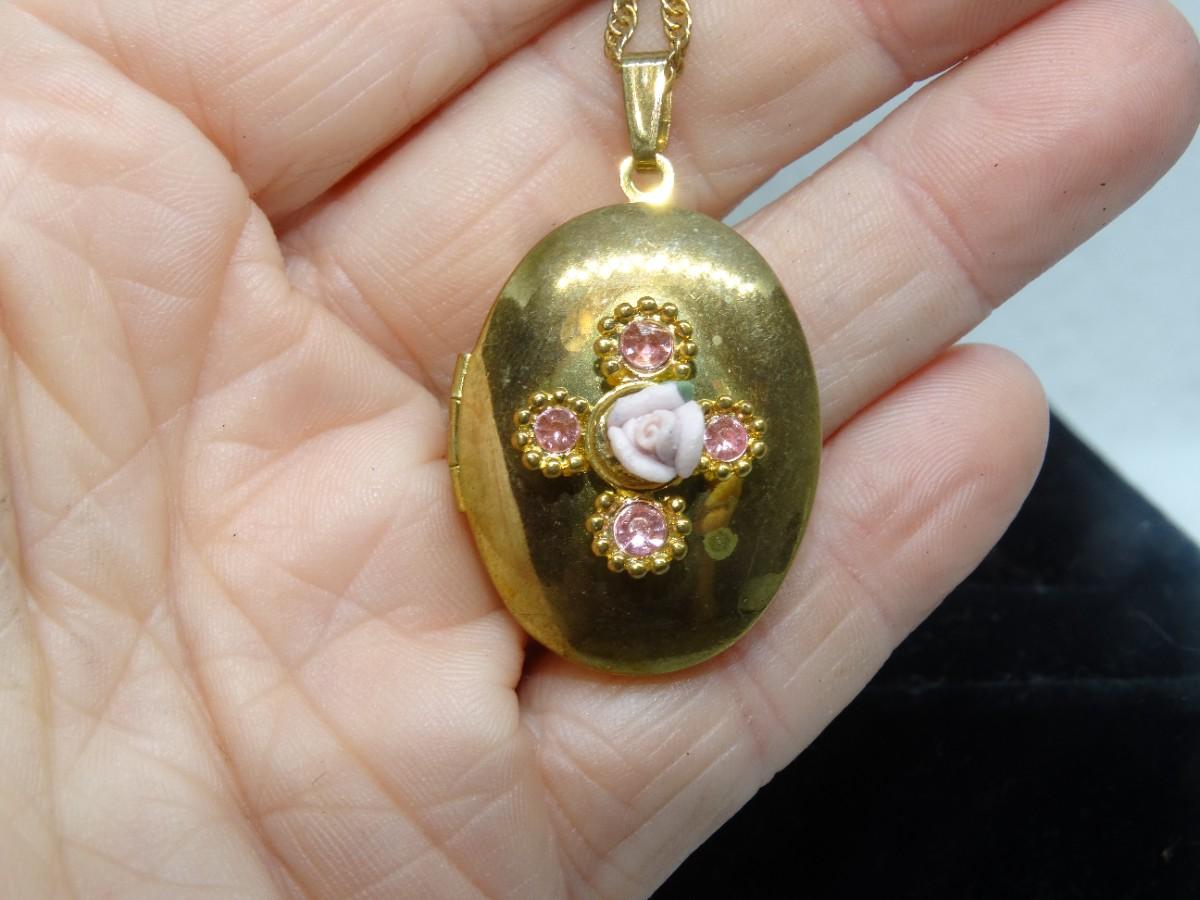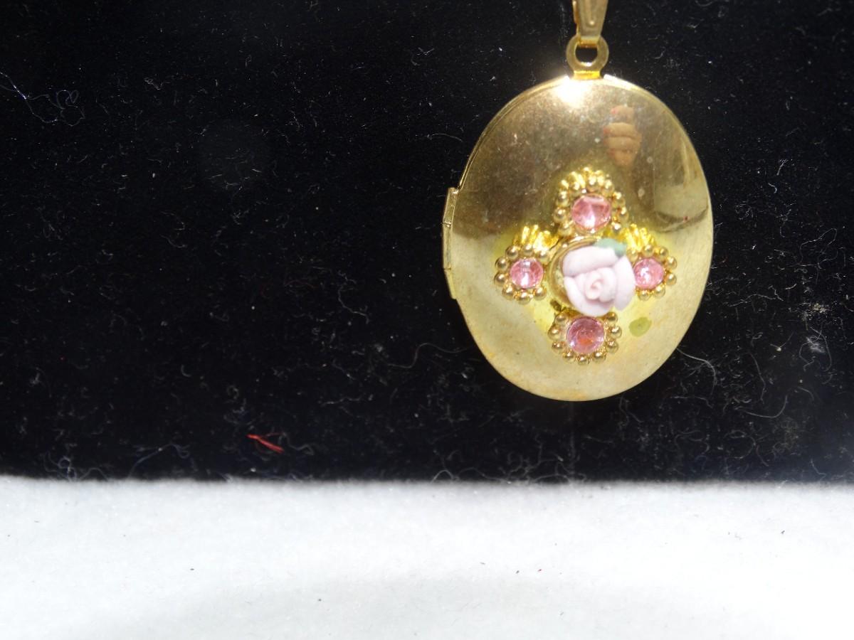 Gold Tone Pink Rhinestone Porcelain Rose Photo Locket
