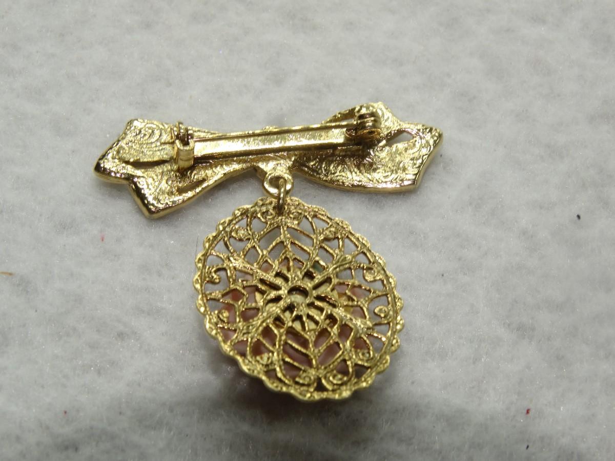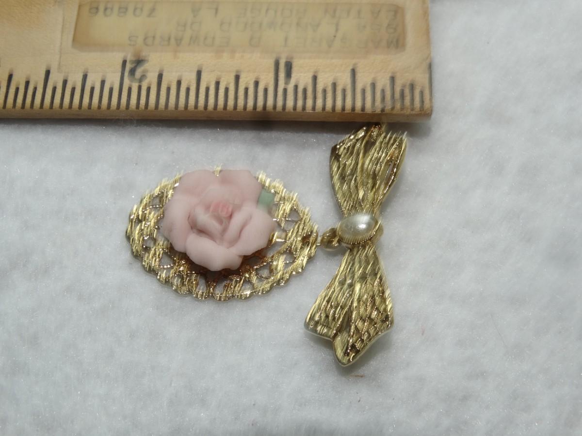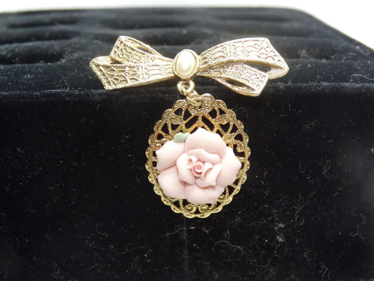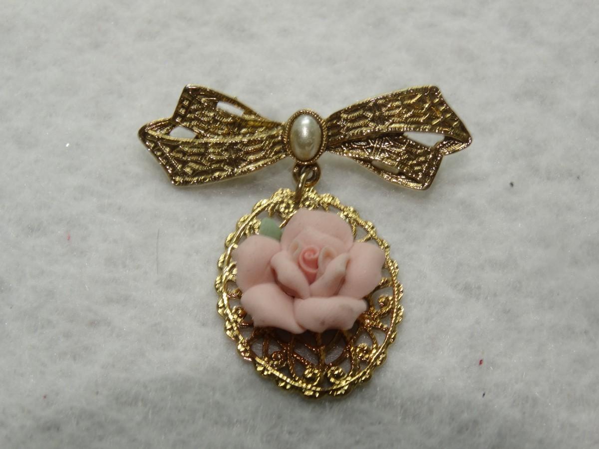 Gold Tone Porcelain Rose Victorian Brooch, Ribbon & Bows, Pearl