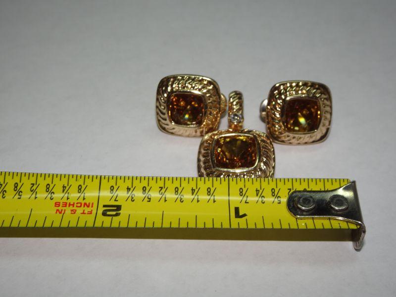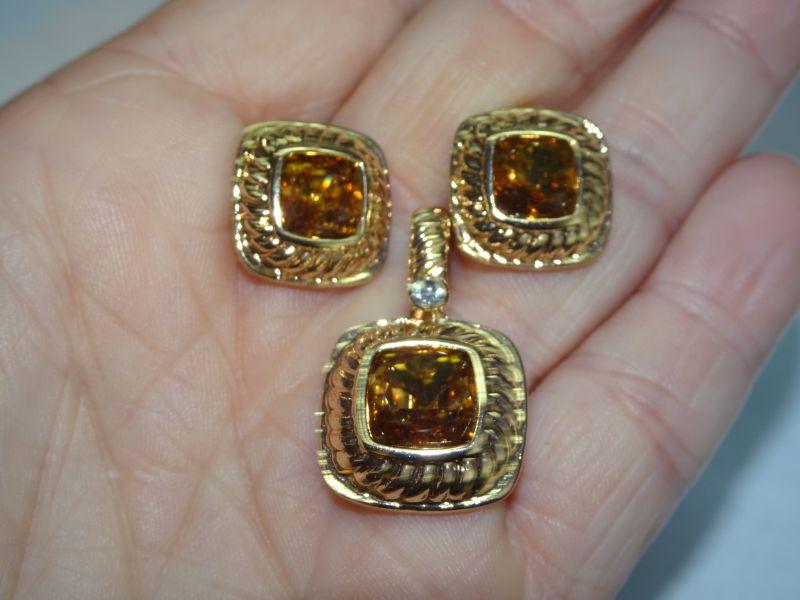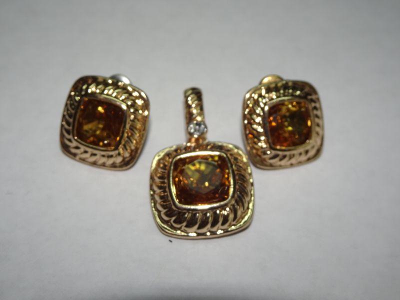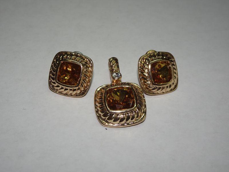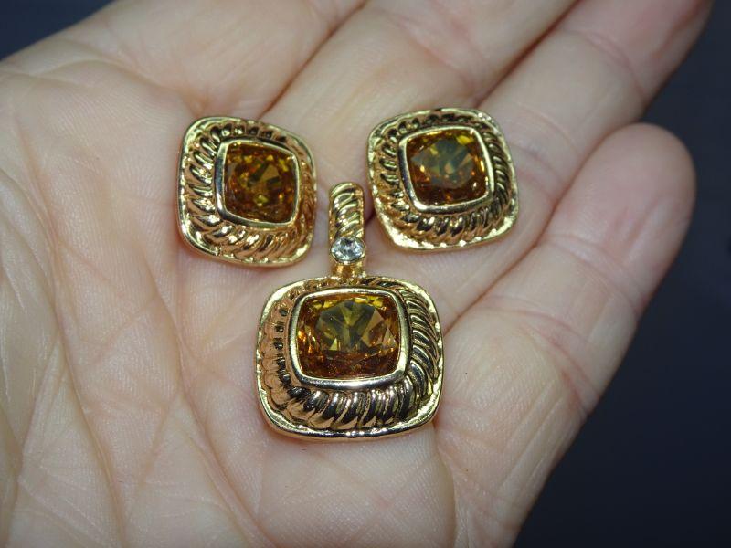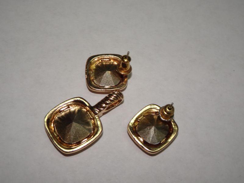 Gold Tone Post Earrings & Diamond Pendant, Gold Gem Stone