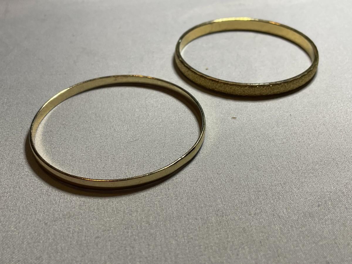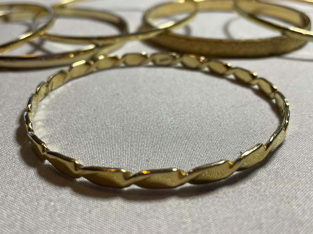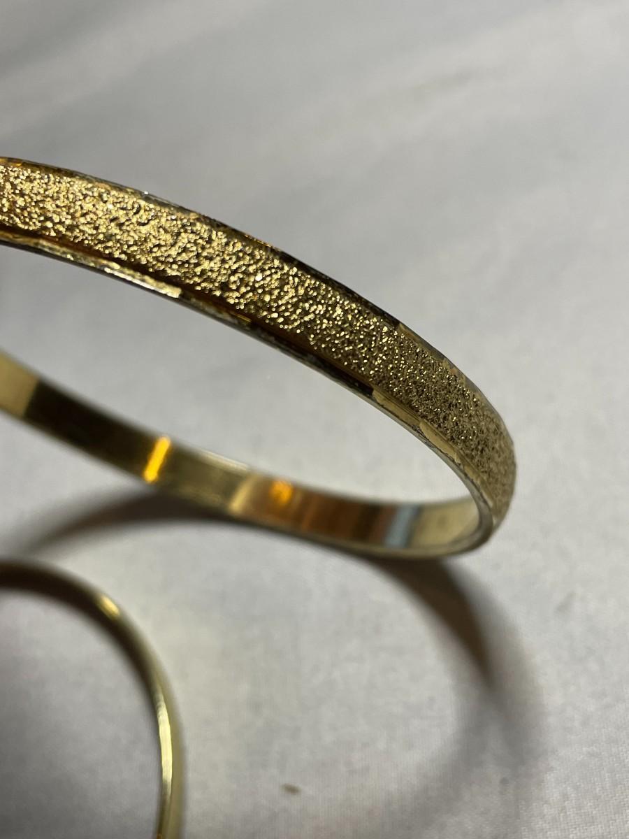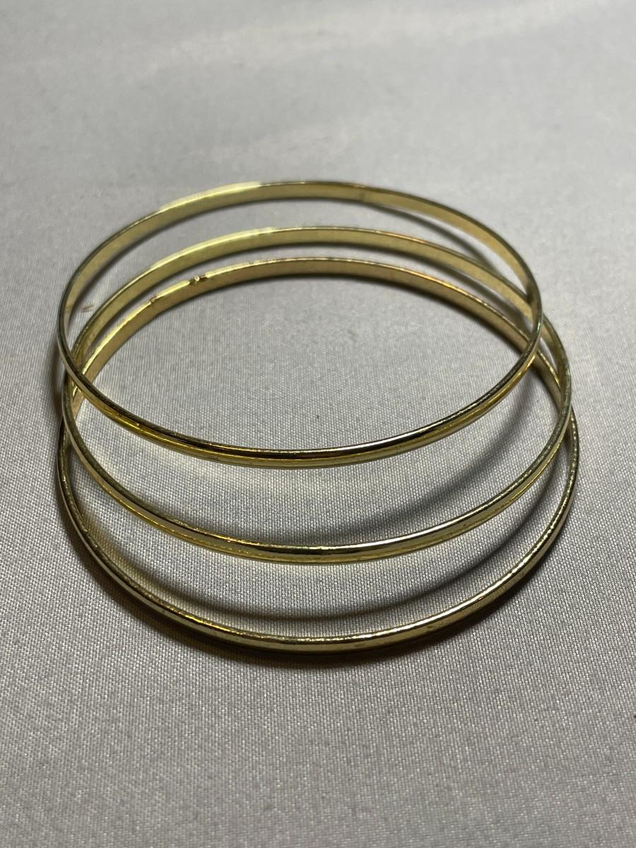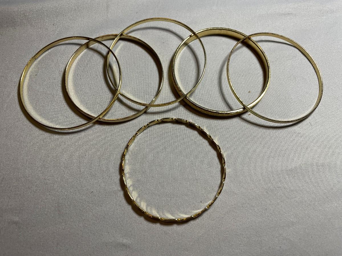 There are a total of six gold tone metal bangle bracelets in this lot and one is just over 2.5 inches in diameter and the others are about 3 inches in diameter. All are in like new condition.