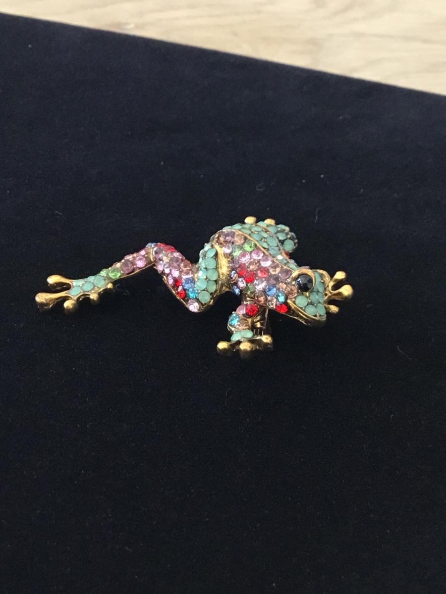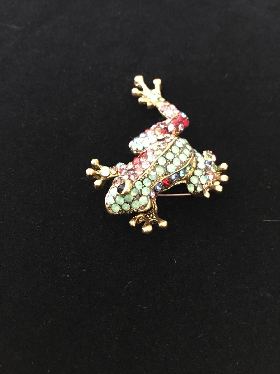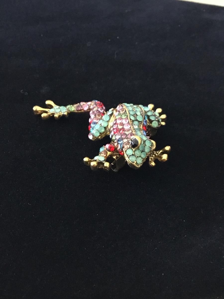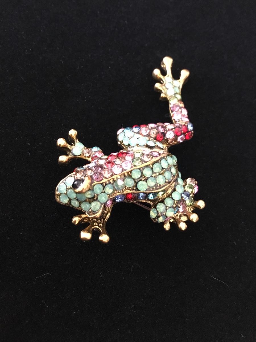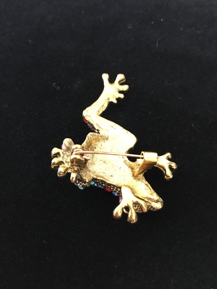 Gold tone rhinestone colorful frog pin