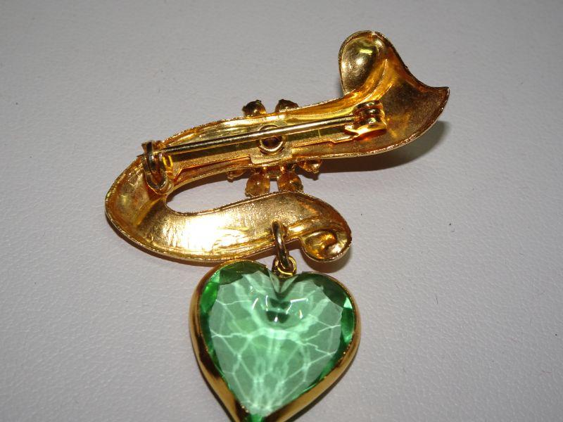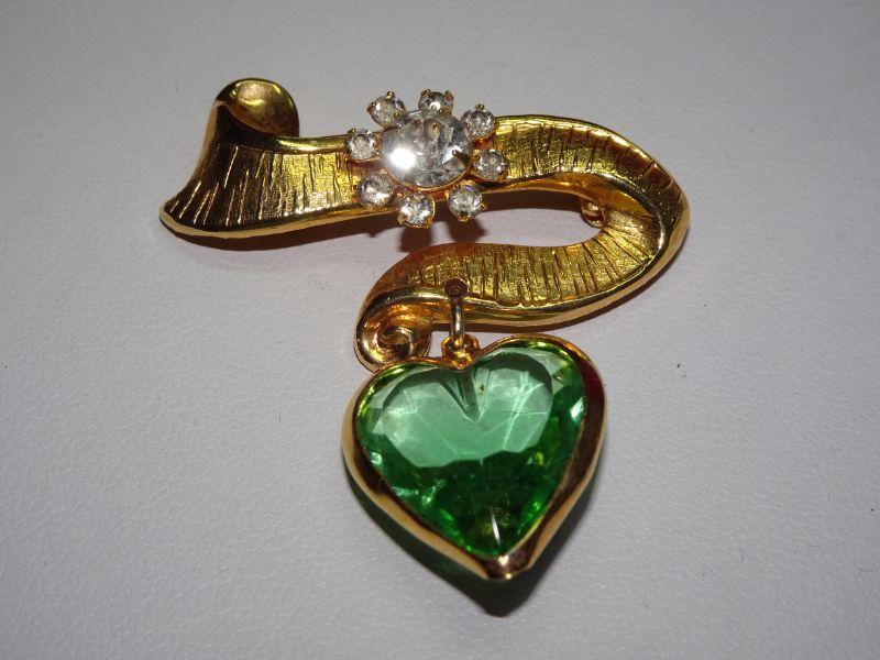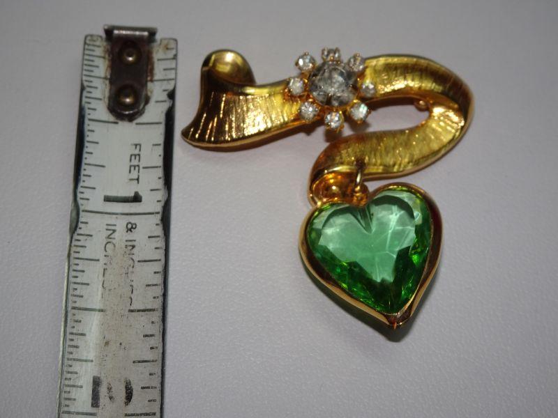 Gold Tone Rhinestone Green Heart Brooch, Swirl Pin