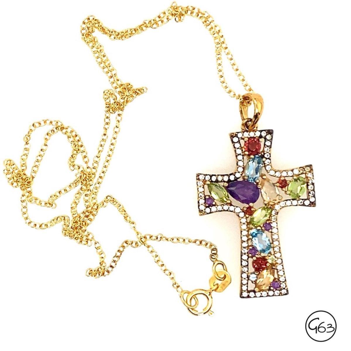 Gold Tone Sterling Multi Gemstone Cross Pendant Necklace