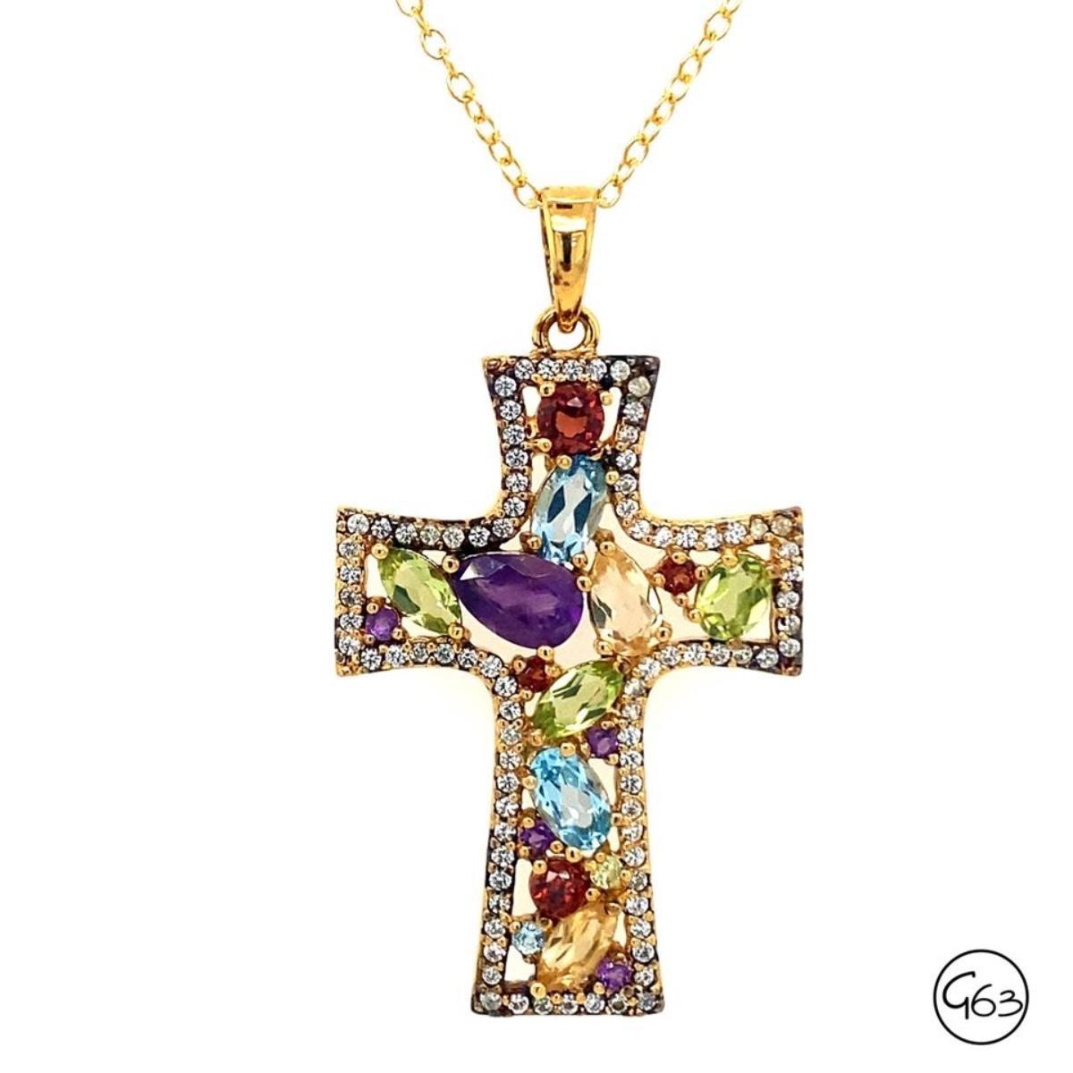 Gold Tone Sterling Multi Gemstone Cross Pendant Necklace