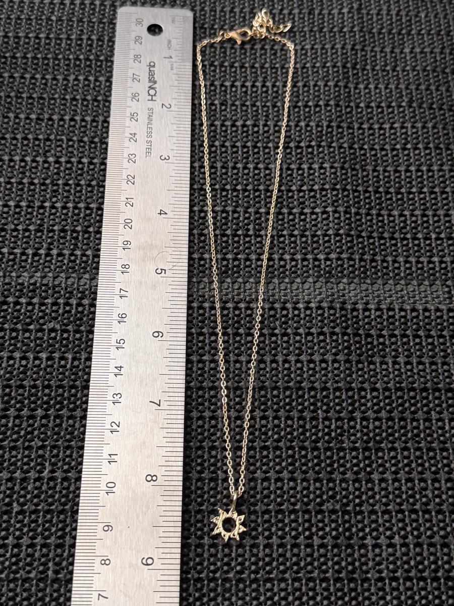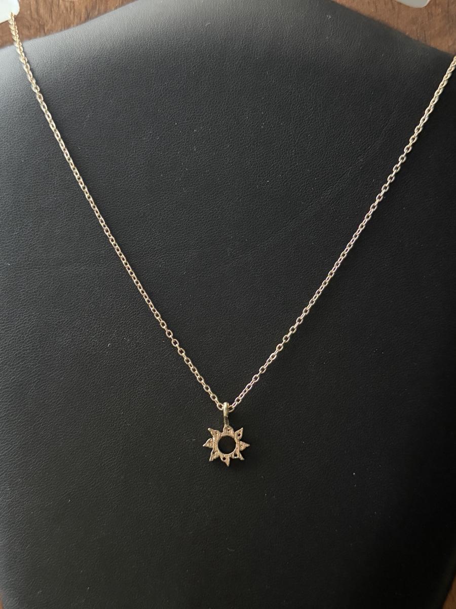 gold tone sun pendant necklace with a "Good Vibes Only" message card.