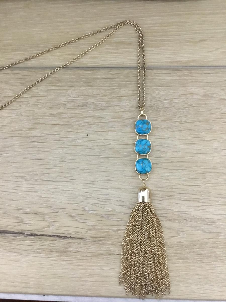 Gold tone tassel long blue fashion necklace