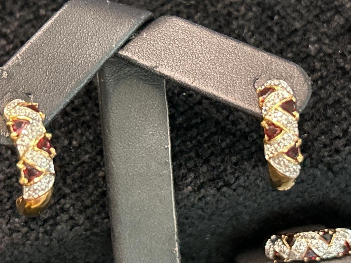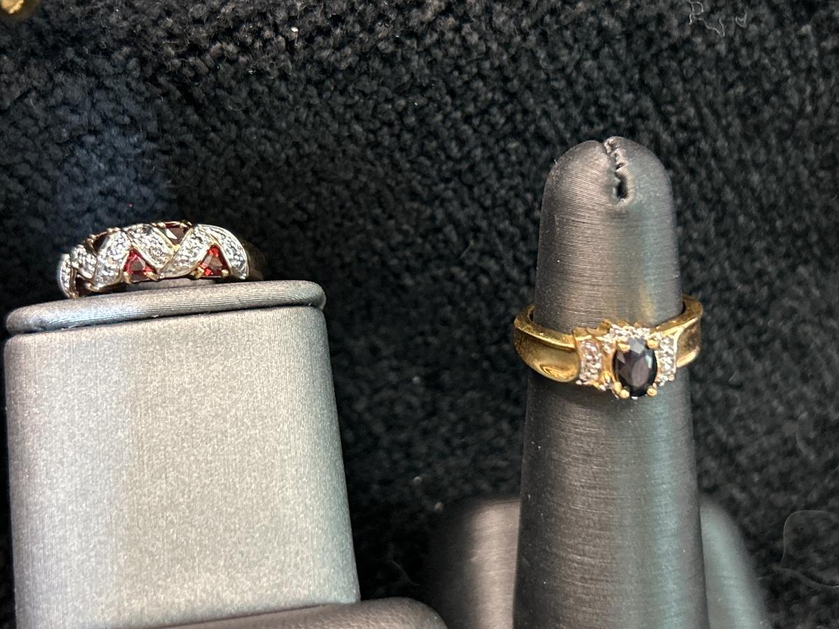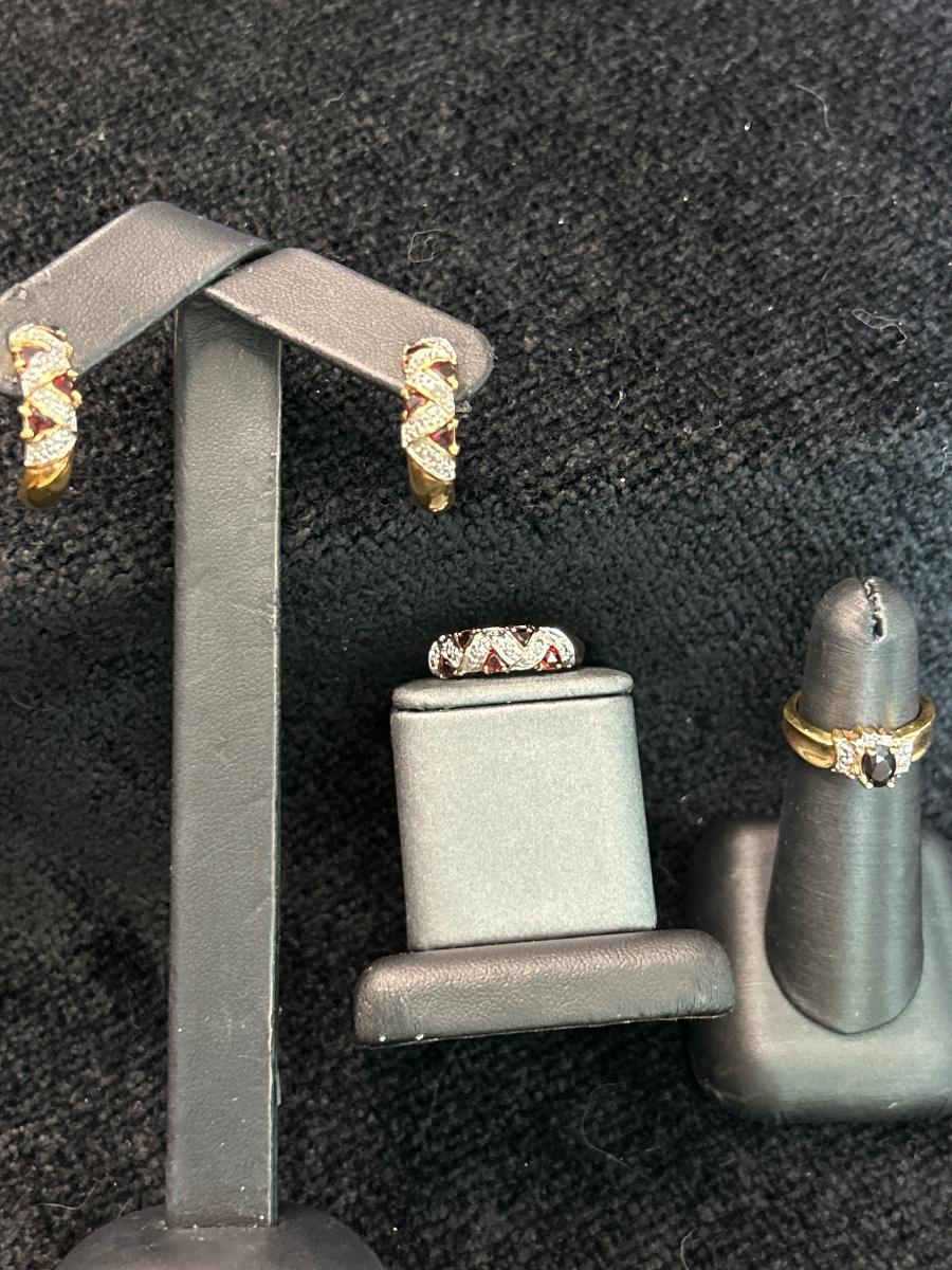 These are very nice & may be diamonds & garnets & sapphire. Earrings are pierced. The 1st ring is size 6 & the other is a 4.5.