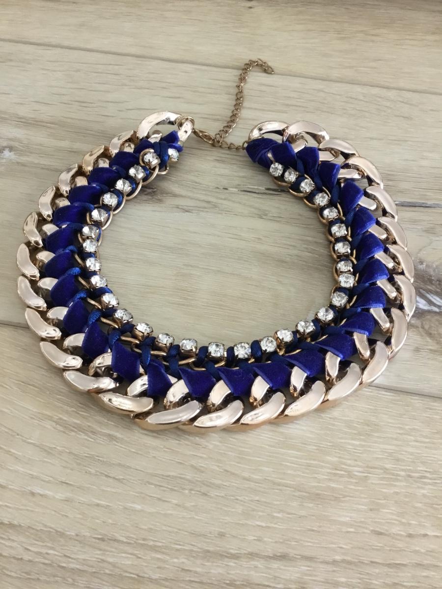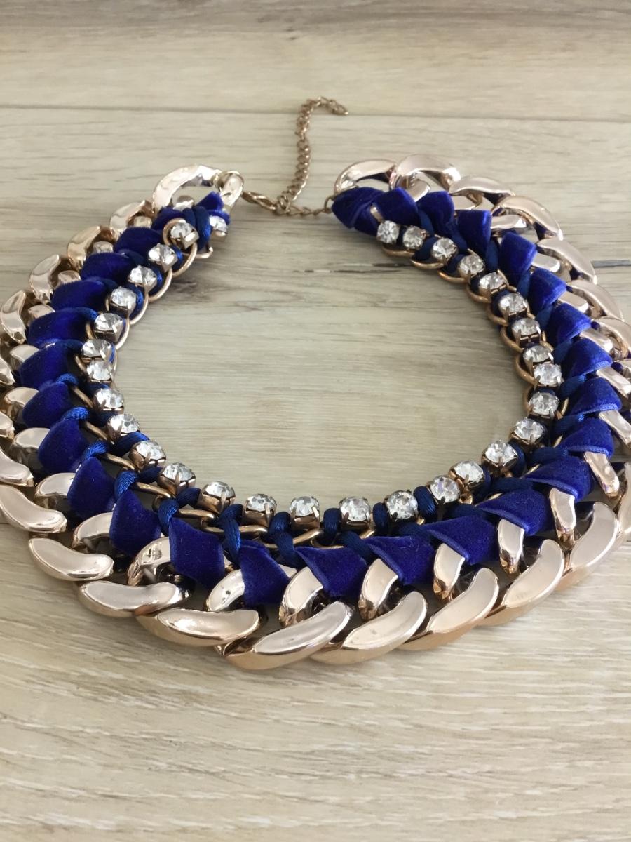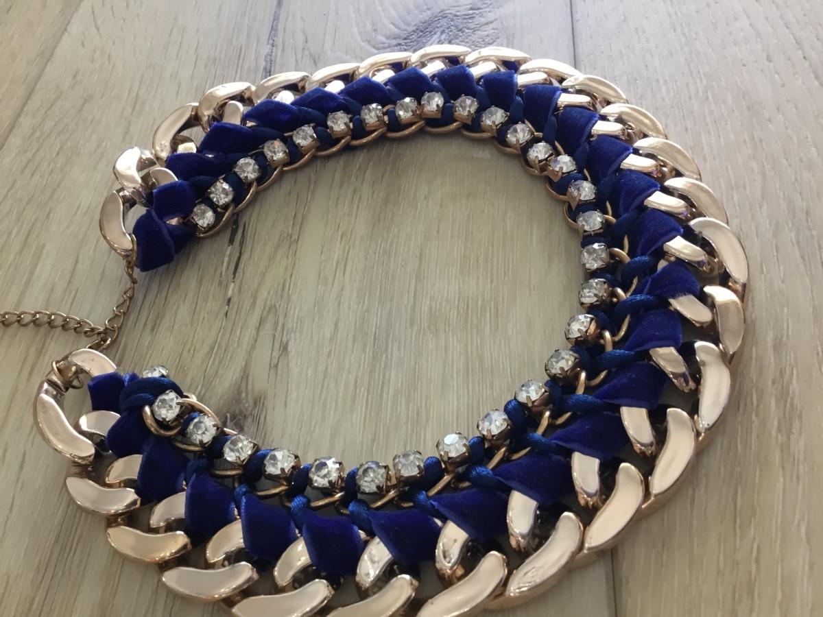 Gold tone, velvety blue fabric with rhinestone collar necklace