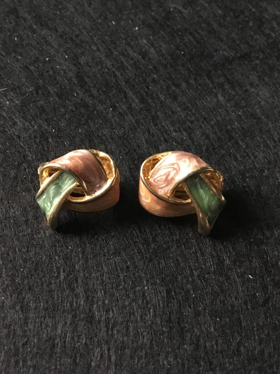 Gold tone vintage knot style clip on earrings with peach, orange, green enamel accent